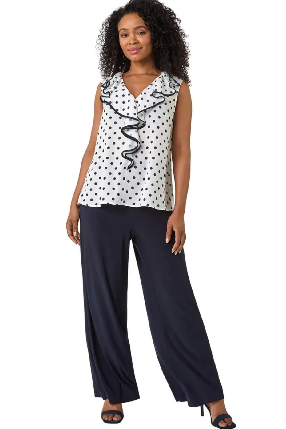 Petite Contrast Spot Print Frill Top from Roman. Add a touch of fun and style to your wardrobe with this feminine Petite frill front top! Showcasing a pretty v-neckline with striking frill detailing at the front, this sleeveless top finishes at the hips and features contrasting binds on the edges for a glam touch. Crafted from a comfortable woven fabric in a playful spot print pattern, this top is perfect for the Spring Summer season. Pair it with a denim jacket and jeggings!