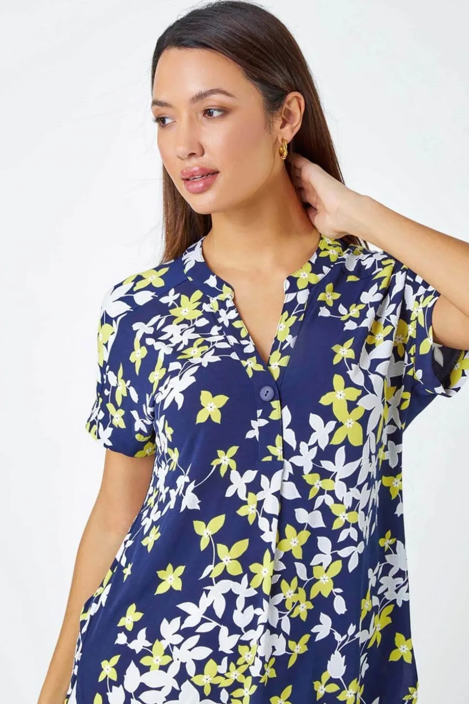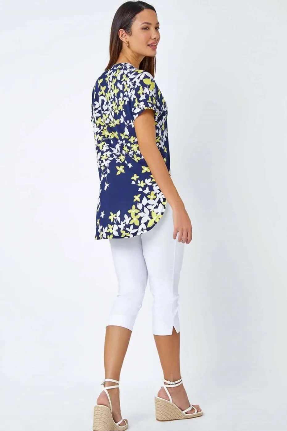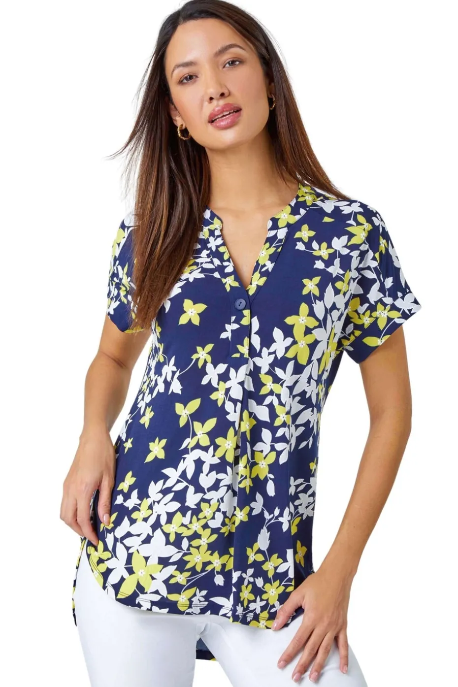 Floral Puff Print V-Neck Pleat Front Top from Roman. Add a pop of colour to your casual collection with this textured, floral print top. Cut from a comfortable stretch jersey fabric, this top features a notch neckline and simple short sleeves. A partially open front is finished with sweet button fastenings, while a single pleat ensures a flattering and relaxed fit throughout. Pair with cropped denim jeans and sandals for effortless Summer style!