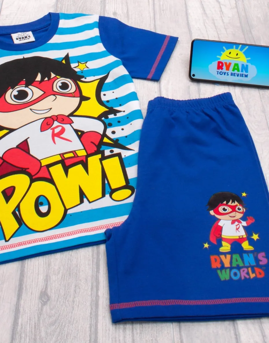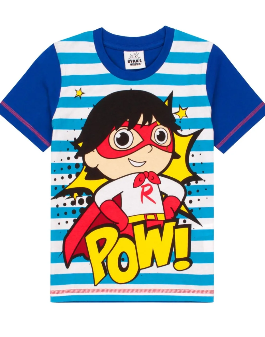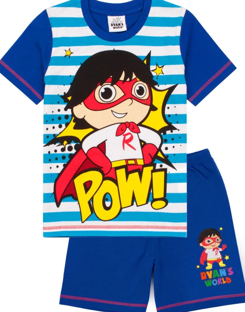 Get your little ones ready for Ryans World adventures at bedtime with this adorable Ryans World Superhero pyjamas for children. Perfect for kids who love watching the popular Youtube channel or playing with Ryans World toys! The cool striped blue and white top features a large pop art comic print of Ryan dressed up as a superhero character underlined with text reading ‘POW’. Paired perfectly with vibrant blue shorts that features a superhero character print underlined with the official logo making a must have gift for Ryans World fans. The kids striking pjs are made from 100% cotton making the set sure to provide comfort and is available in sizes; 2-3 years, 3-4 years, 4-5 years, 5-6 years, 6-7 years and 7-8 years. This item is 100% genuine licensed Ryans World merchandise & features official branding throughout. We want you to get the most out of your new fun pyjamas, so please be sure to follow all care label instructions and contact our dedicated customer service team for any additional information or sizing queries.