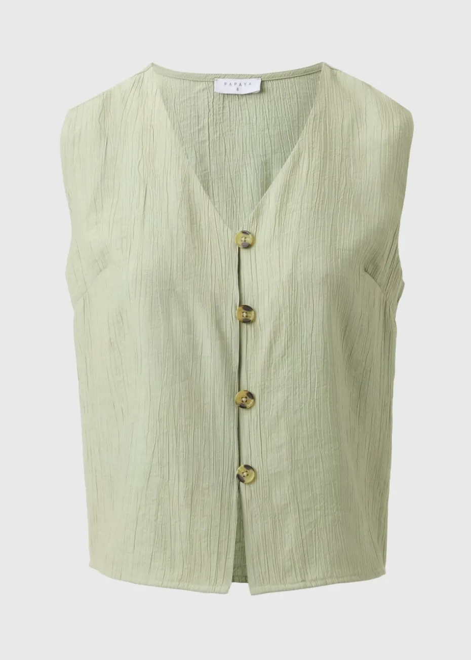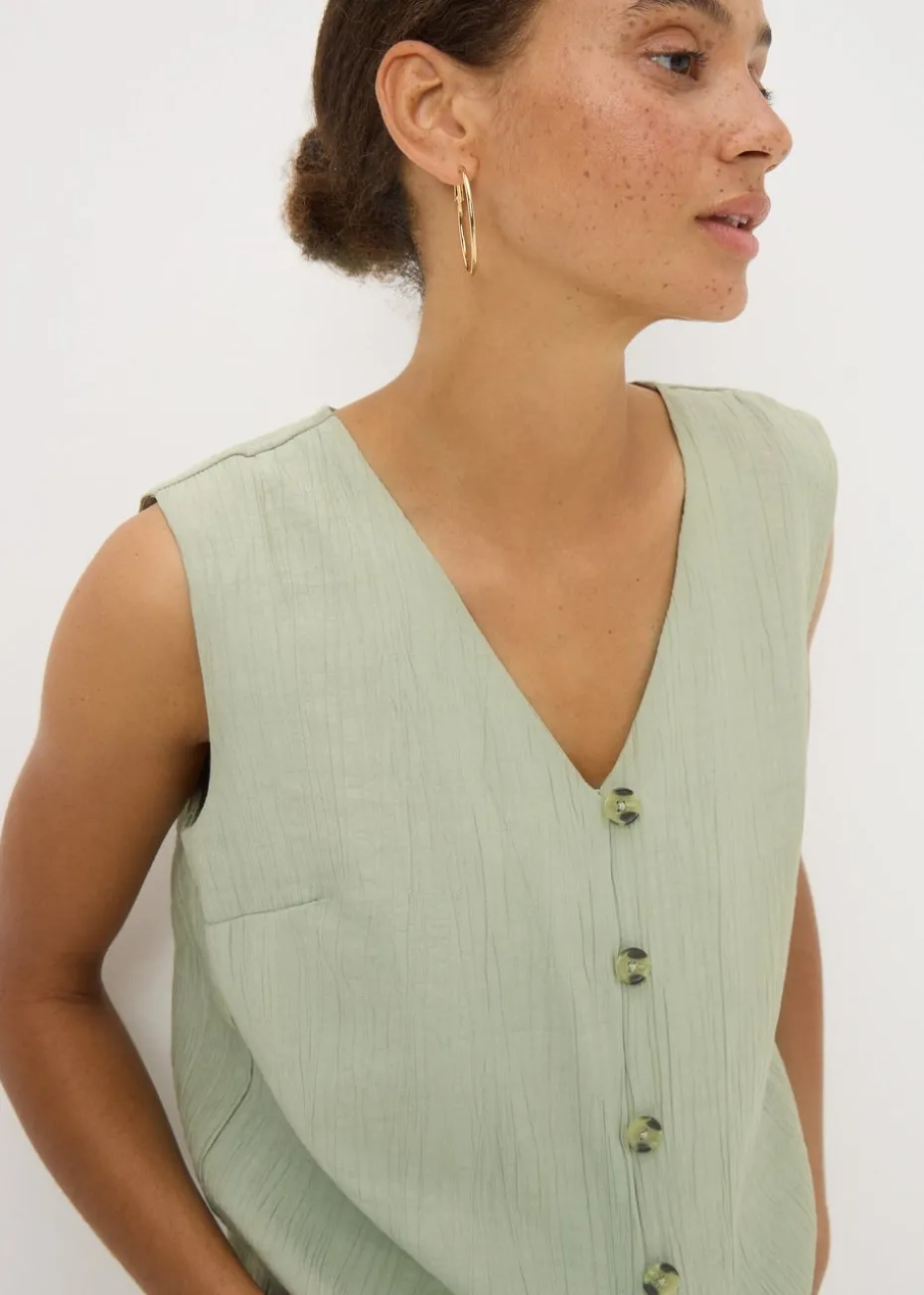 Add a tailored touch with a feminine twist in this Sage green Textured Button Front Waistcoat. Designed with a structured yet lightweight fabric, it features a subtle textured finish and a classic button-up front for a polished look. The soft sage green hue brings a fresh, modern feel — perfect for layering over a crisp shirt or wearing solo for effortless style.