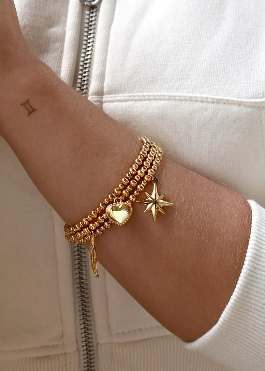 This beautiful stainless steel stack features several dainty charms, including a Heart, a shell, a star and a heart – and should be worn as a reminder that you are not alone, you are stronger than you feel, and to always find the light. Set Of 3 Bracelets Product Information Size : Approx. 7-inches. Material : Stainless steel Gold