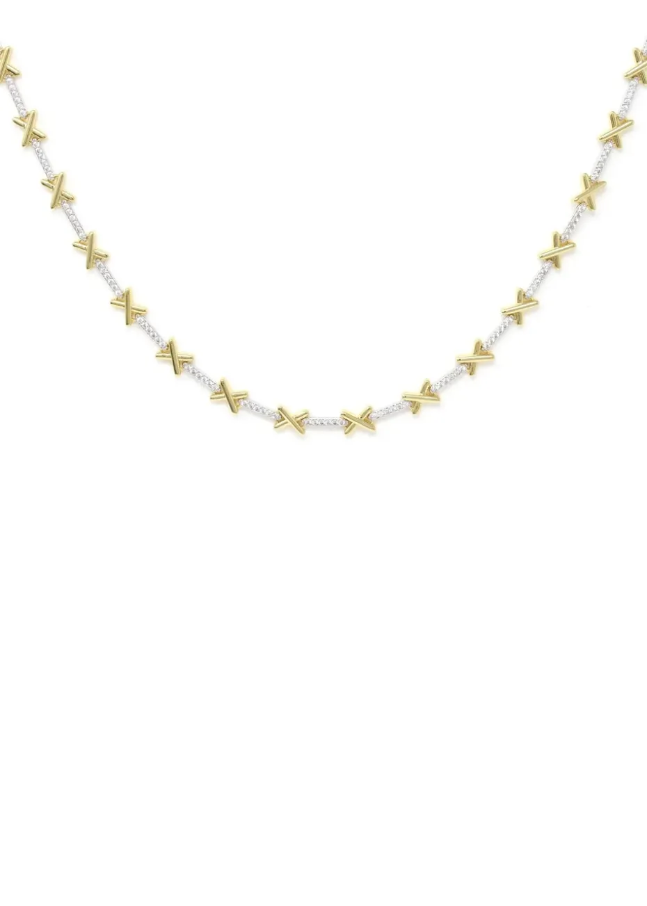 Turn heads with our Luxe Kiss Tennis Necklace. Our tennis necklace is made up stainless steel and CZ stones decorated beautifully with a contrasting yellow gold kiss design. Wear it alone or stack it with our other necklaces for the perfect layered look. Length : 16 inch Material : Stainless steel Gemstone : Cubic zirconia stones.