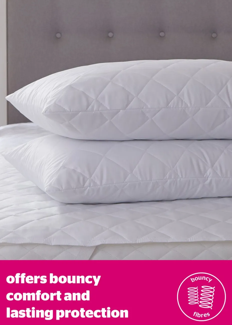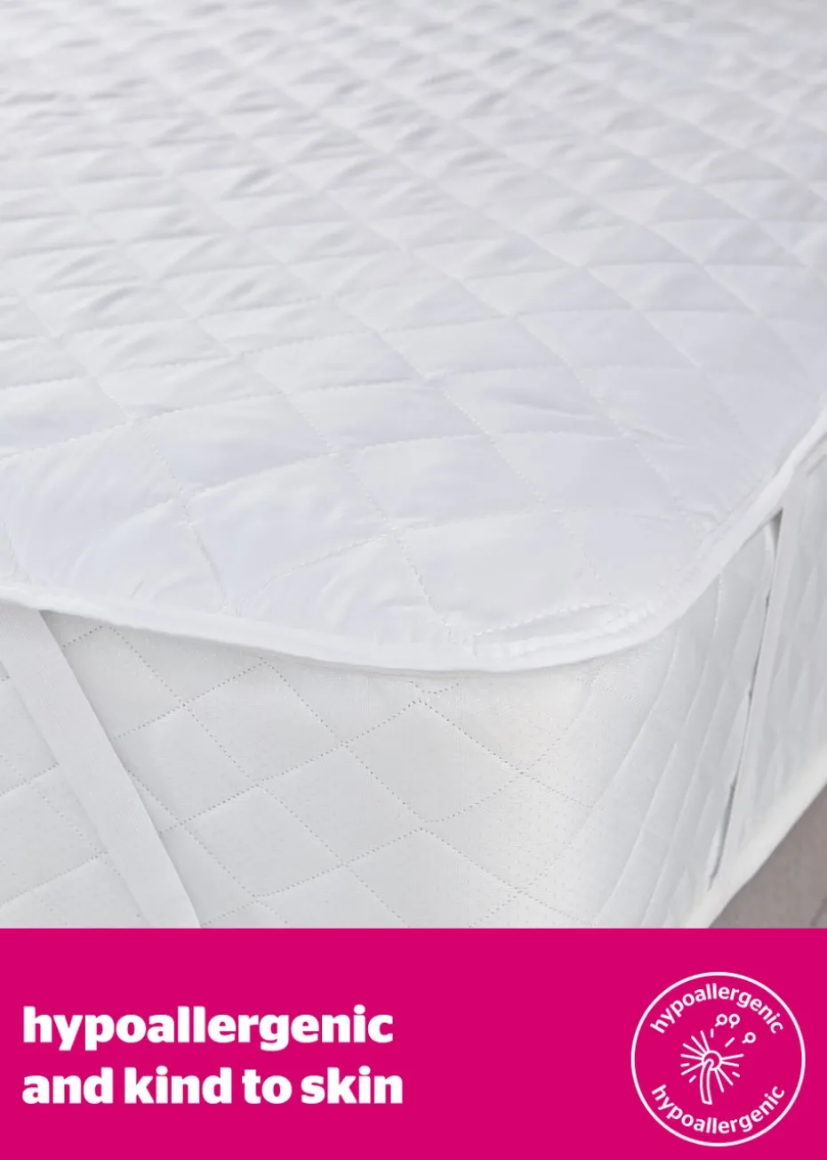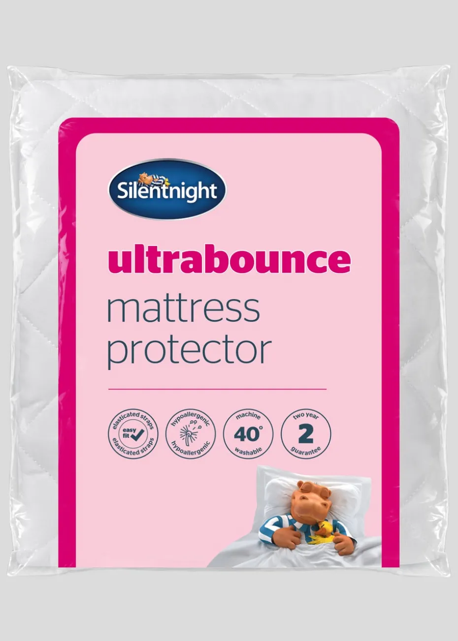 The Ultrabounce mattress protector by Silentnight will help to protect and prolong the life of your mattress. The protector is generously filled with comfy, springy hollowfibre that bounces back and retains shape after use. The soft microfibre cover promises comfort as well as protection, while the elasticated corner straps are easy to fit and simply stretch over the corners of your mattress. The protector is also machine washable, hypoallergenic and comes with a two year manufacturer’s guarantee for peace of mind.