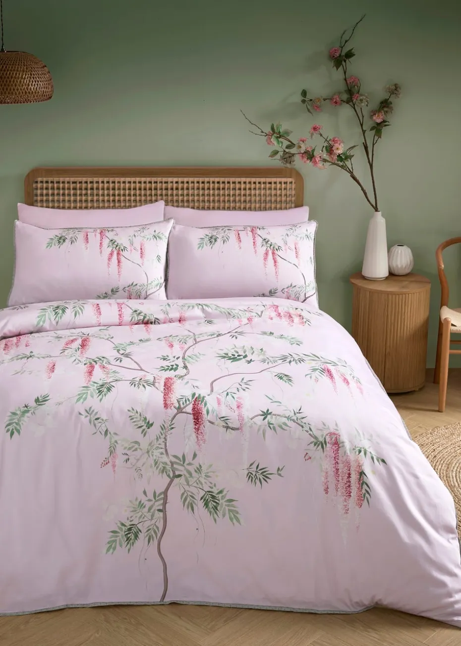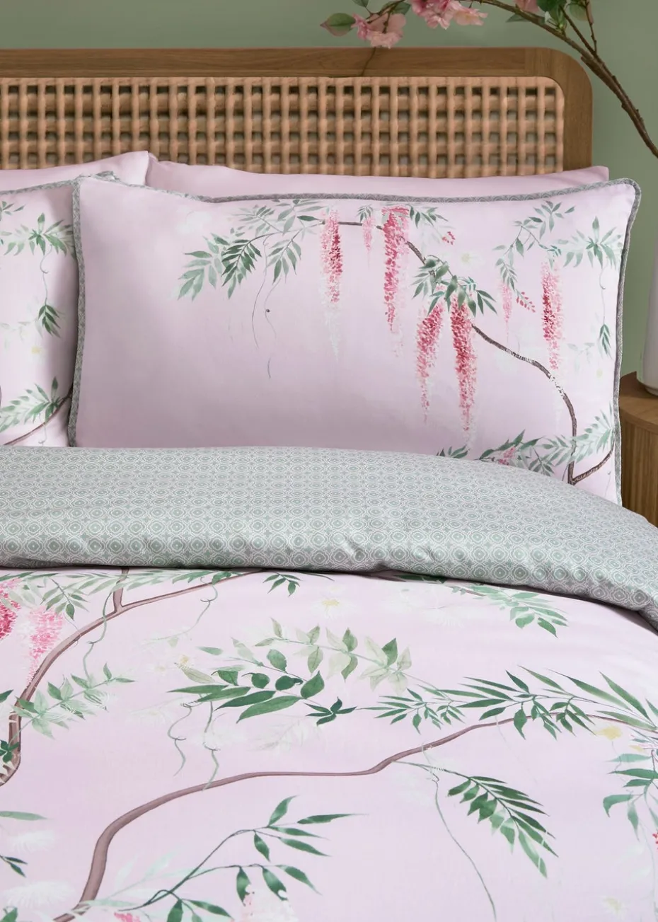 Adorn your bedroom with the delicate allure of blush-toned Wisteria on 200-thread-count, 100% cotton sateen – a caress of luxury against the skin. Turn to the reverse, where a captivating pink mini geo dances upon a lush green canvas, promising a bedroom statement of opulence and elegance.