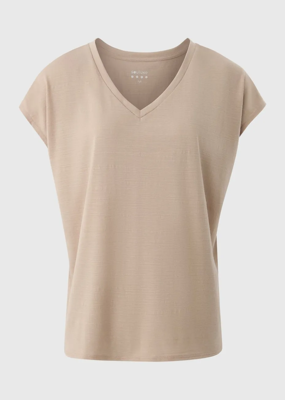 Elevate your activewear with the Souluxe Stone V-Neck T-Shirt — designed for movement and made for comfort. Crafted from lightweight, breathable fabric, this short-sleeved tee features a flattering V-neckline and a soft stretch finish to keep you comfortable through every workout. Perfect for gym sessions, outdoor training, or relaxed athleisure looks.