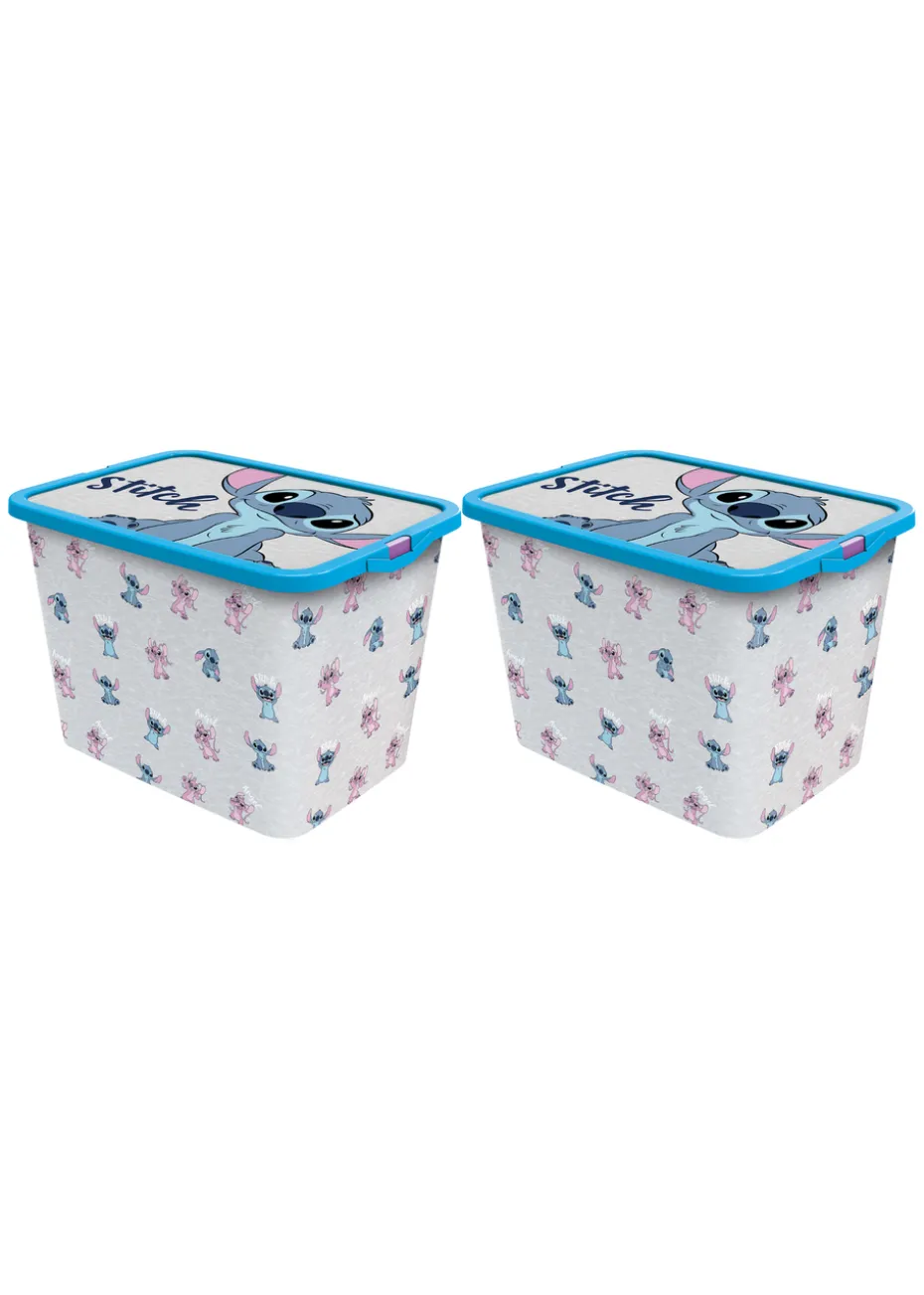 Keep your child’s room organised with this set of 2 23L Stitch Storage Boxes. Perfect for storing toys, clothes and other items, these plastic boxes come with a lid to keep everything neatly tucked away. Measuring 38cm in height, 28cm in length and 27cm in width, this blue box is ideal for children’s rooms and matches perfectly with Stitch themed décor. The storage box is made of durable plastic and features the Stitch alien. It is perfect for children who love Lilo & Stitch and need a place to keep their belongings. This versatile storage solution will help keep your child’s room clean and tidy, while also adding a touch of fun and playfulness to the room.