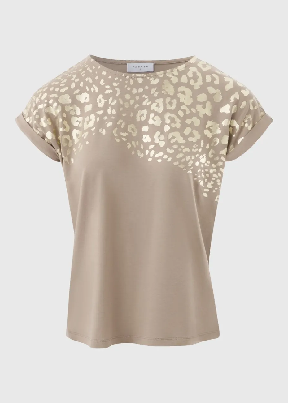 Elevate your everyday style with our taupe animal foil print t-shirt. This chic and versatile sweater is crafted from a soft and luxurious fabric, featuring a striking animal foil print that adds a touch of sophistication to any outfit.