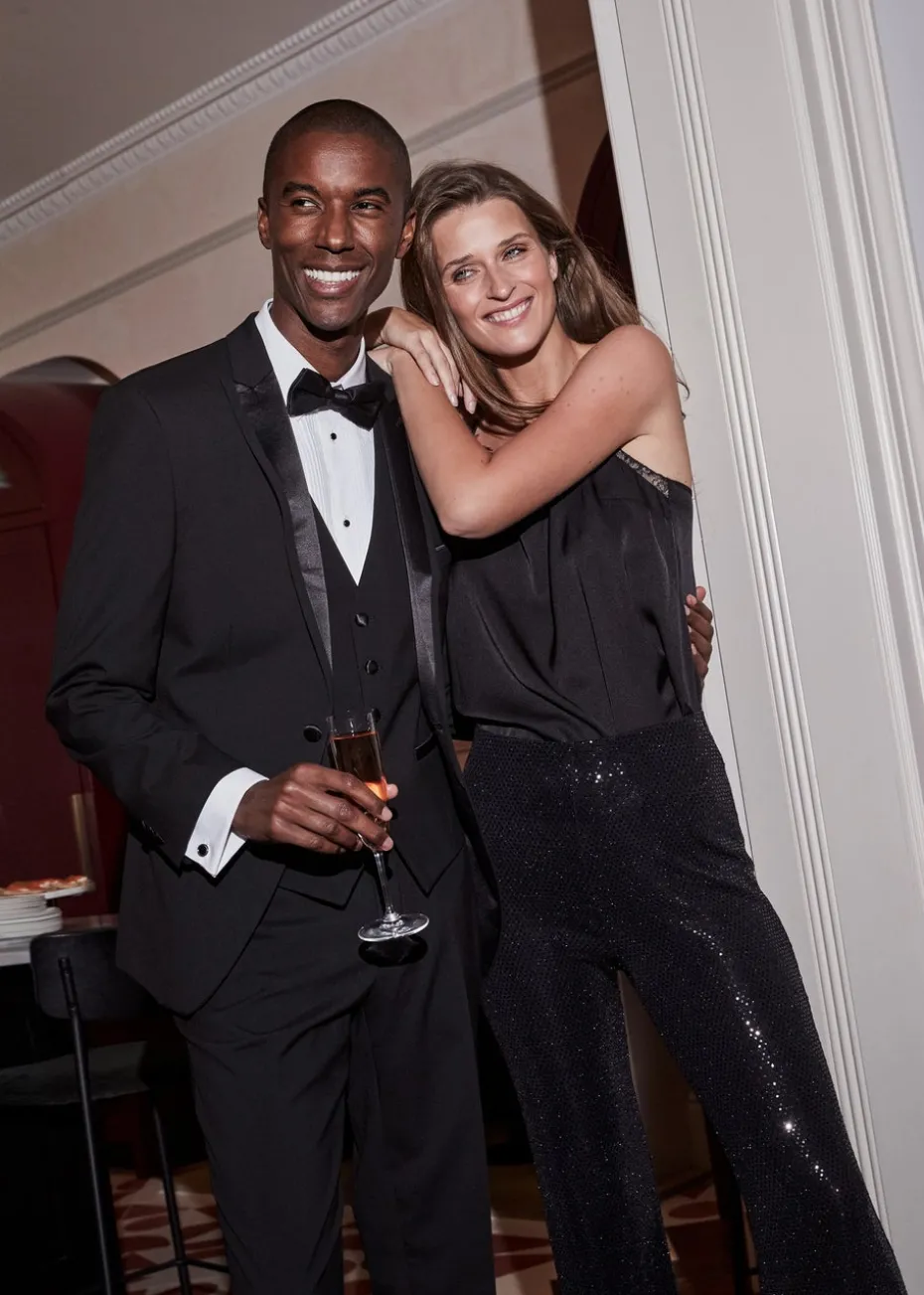 Are you prepping for a fancy occasion this season? Take your formal collection to the next level with this dapper dinner suit jacket from the Taylor & Wright range. Cut with wrinkle-resistant black fabric and featuring smooth satin contrast detailing to the lapels and pocket edges, this jacket is styled to a modern tailored fit and comes as part of a 3-piece set. Matching suit waistcoat and trousers available. Model Height: 6ft 1/2. * Pockets on Taylor & Wright products are loosely stitched for transit, but the stitching can easily be removed to make the pockets functional. * Model Wears: Medium. ** _Whether you’re looking to sharpen up your workwear or getting set for a special occasion, our Taylor & Wright formal collection ticks all the boxes. Combining a premium finish and quality with modern tailoring and a choice of fits, our diverse range of contemporary suits and separates provide smart style solutions for any event._**