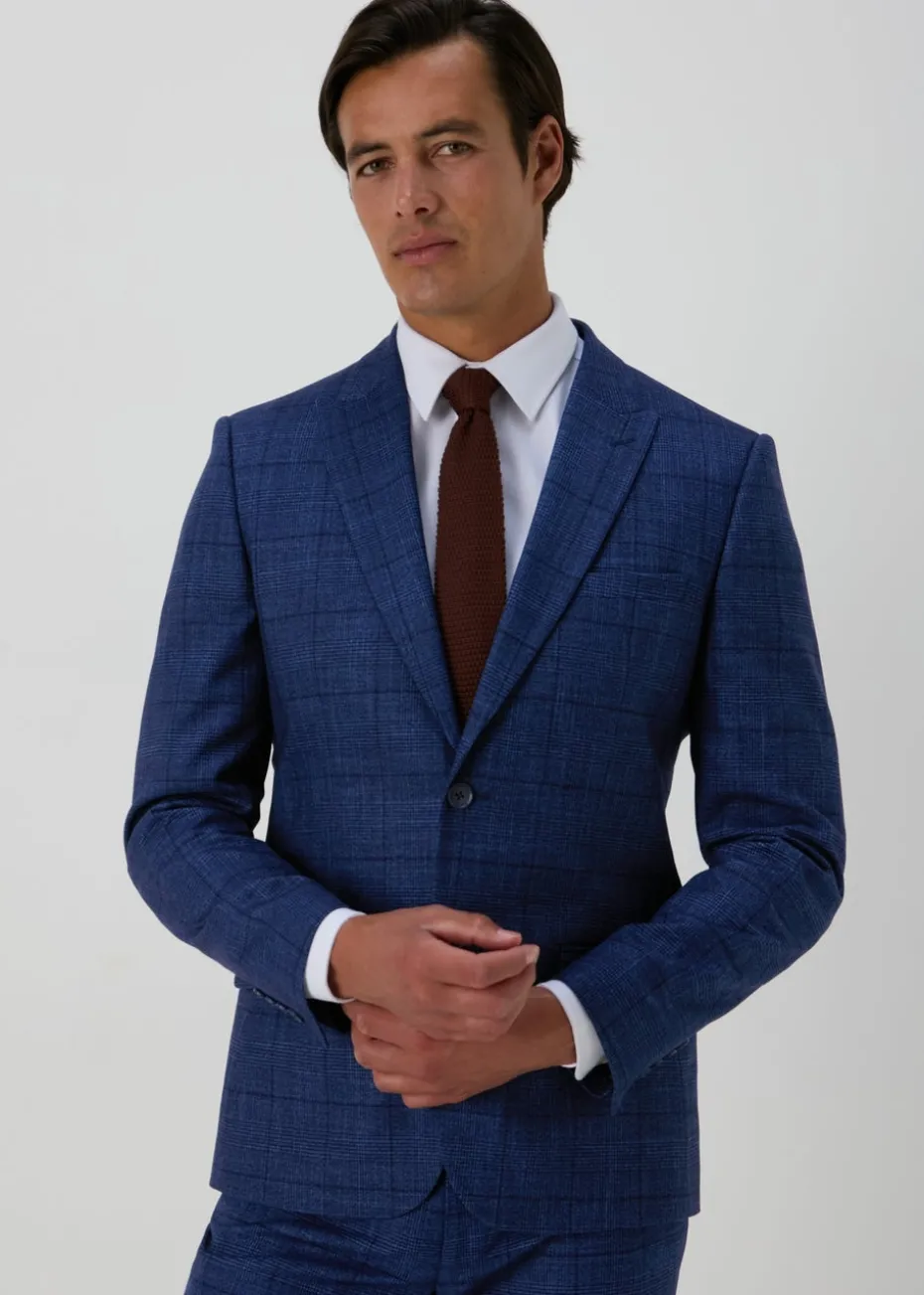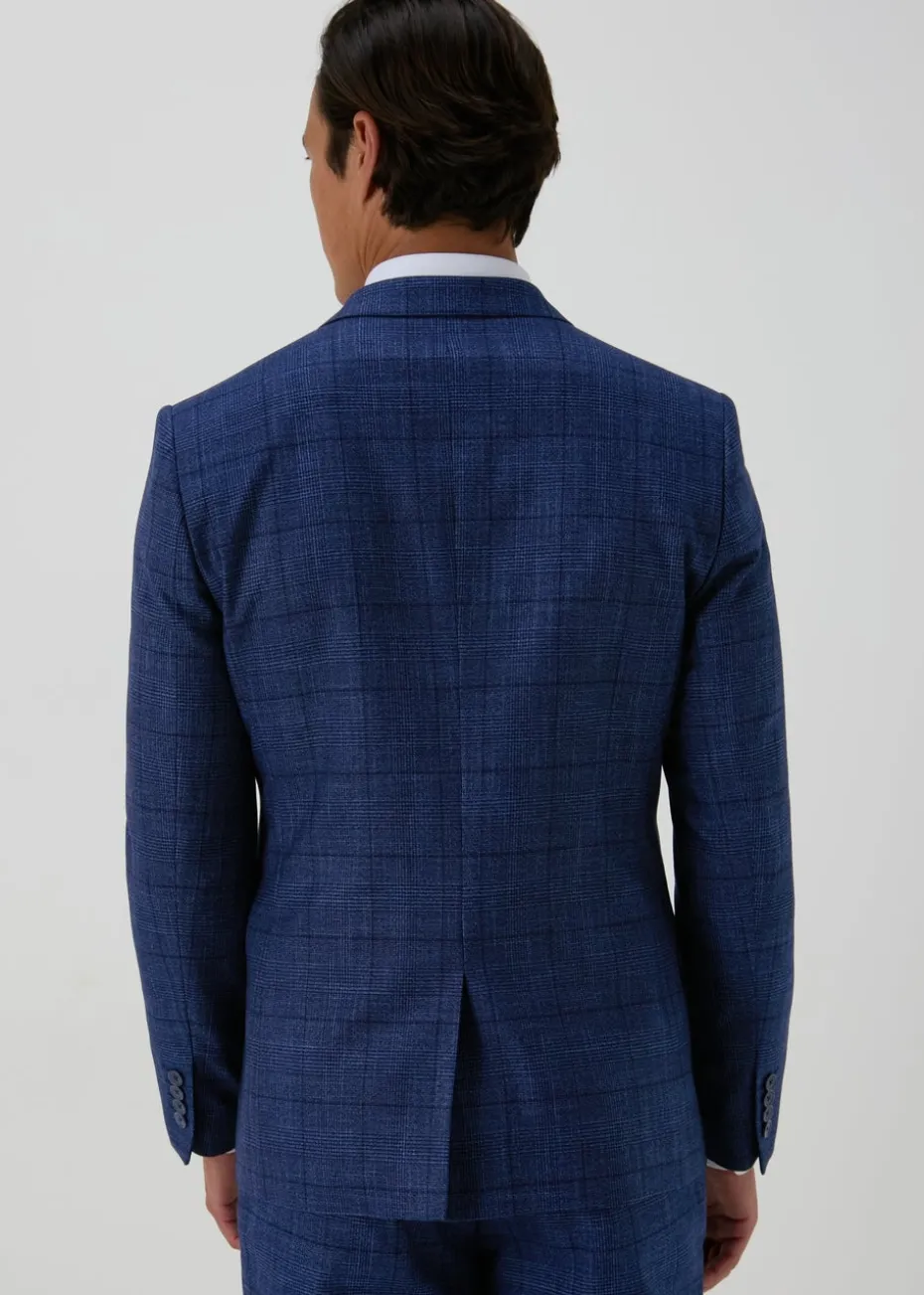 Introducing the Taylor & Wright Navy Chatsworth Slim Fit Suit Jacket, the must-have addition to your menswear collection. Crafted from the finest fabrics, this jacket exudes sophistication and effortless style. Its streamlined silhouette and impeccable tailoring ensure a sharp, contemporary look that complements any man’s physique. The -navy blue colour and check pattern adds timeless elegance to any ensemble. Pair with a crisp white shirt, tailored trousers, and polished leather shoes for a classic business look.