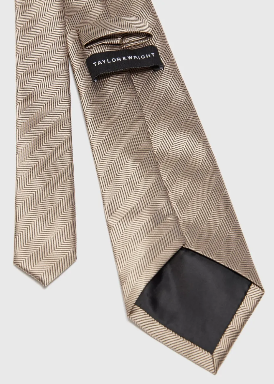 Elevate your formal attire with the Taylor & Wright Taupe Herringbone Tie, a perfect blend of sophistication and modern style. This premium tie features a rich taupe base adorned with a subtle herringbone pattern, offering a refined and eye-catching touch to any ensemble.