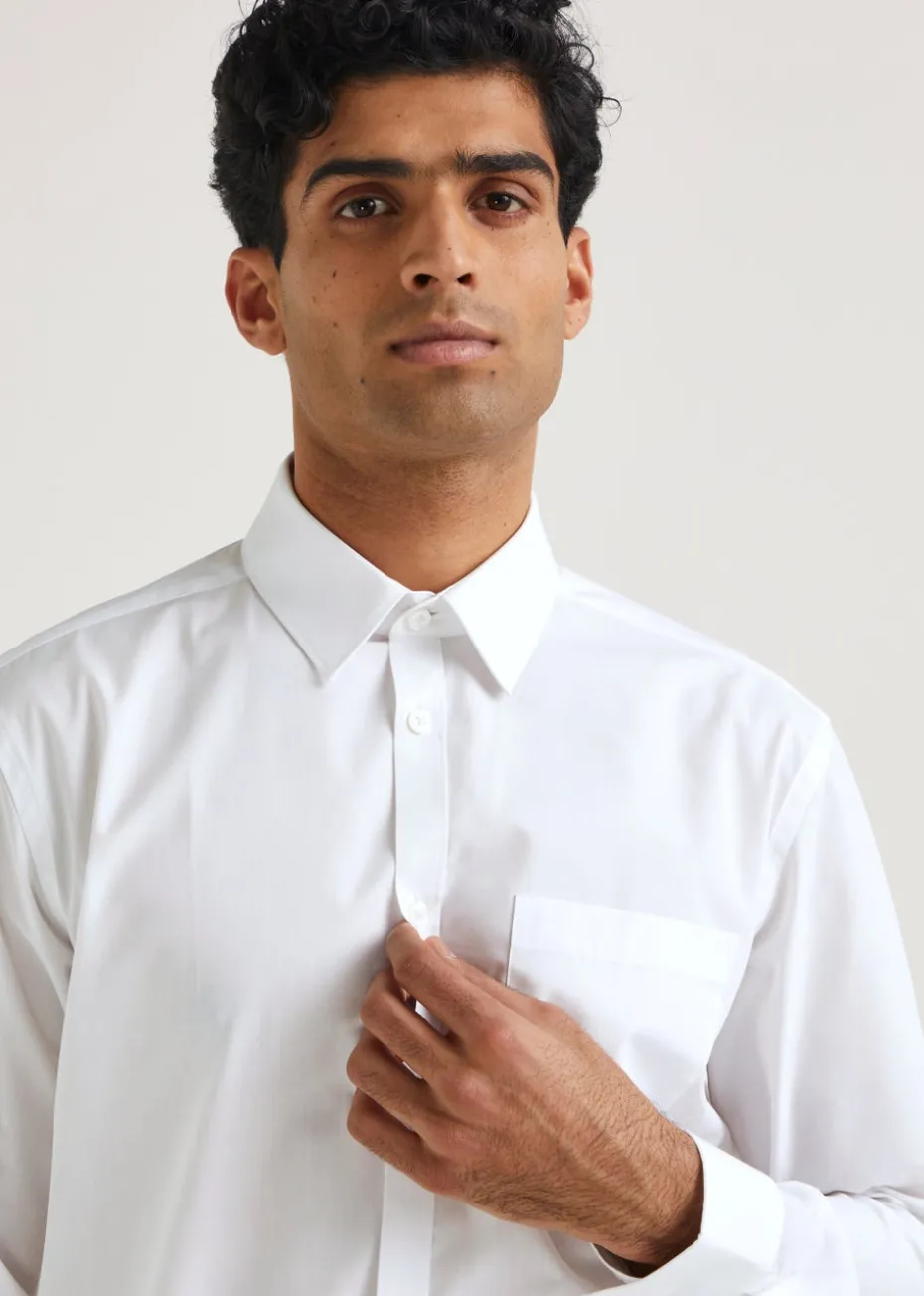A must-have in any modern gent’s wardrobe, this easy-care shirt by Taylor & Wright is a versatile staple. Crafted from a soft and sturdy polycotton blend, the shirt is styled in white and features buttoned cuffs, long sleeves, a conventional placket, and a smart forward point collar. Ideally suited to office wear, this shirt can also be paired with a suit for formal occasions. Model Wears: 6ft 2.