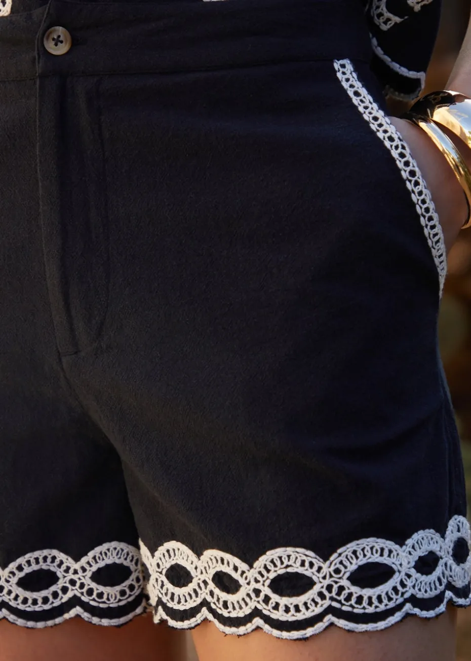 Refresh your summer wardrobe with these cornelli shorts from Threadbare. Crafted from a lightweight 100% cotton fabric, featuring delicate cornelli embroidery and a scalloped hem for a soft, textured finish. They fasten with a button and zip fly and have two side pockets and two back welt pockets for a practical touch. Style with the matching cornelli shell top for an effortless holiday co-ord. Model wears UK size 8.