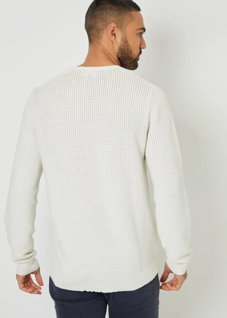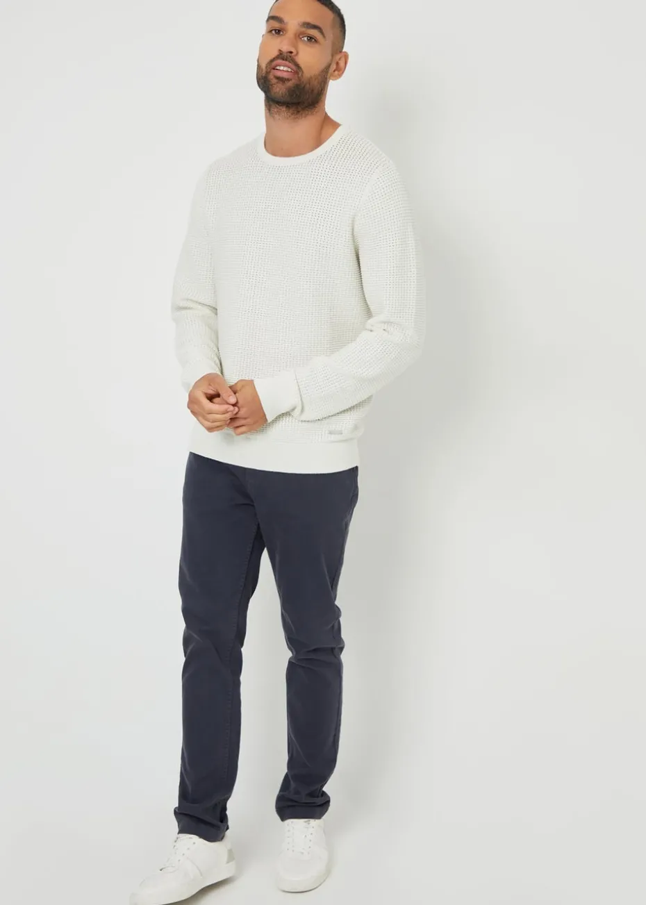 Upgrade your knitwear staples with this crochet knit jumper from Threadbare. In a textured crochet knit, this crew neck jumper is made from cotton blend recycled yarns and is designed for everyday wear. Made in a regular fit with ribbed cuffs and hem and finished with the signature Threadbare metal hem badge for brand recognition. Pair with chinos or jeans for a smart casual everyday outfit.