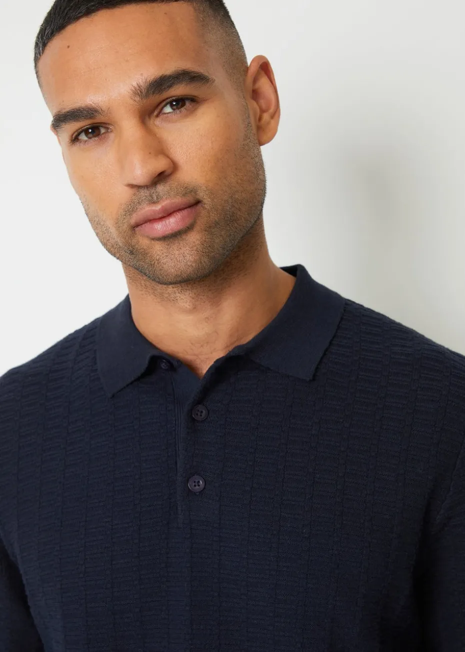 Threadbare Navy Long Sleeve Textured Knit Polo Collar Jumper