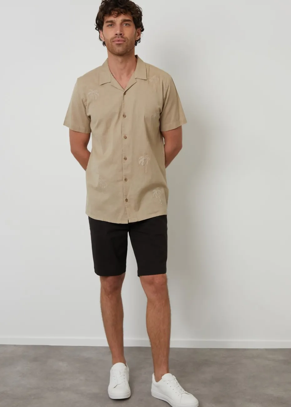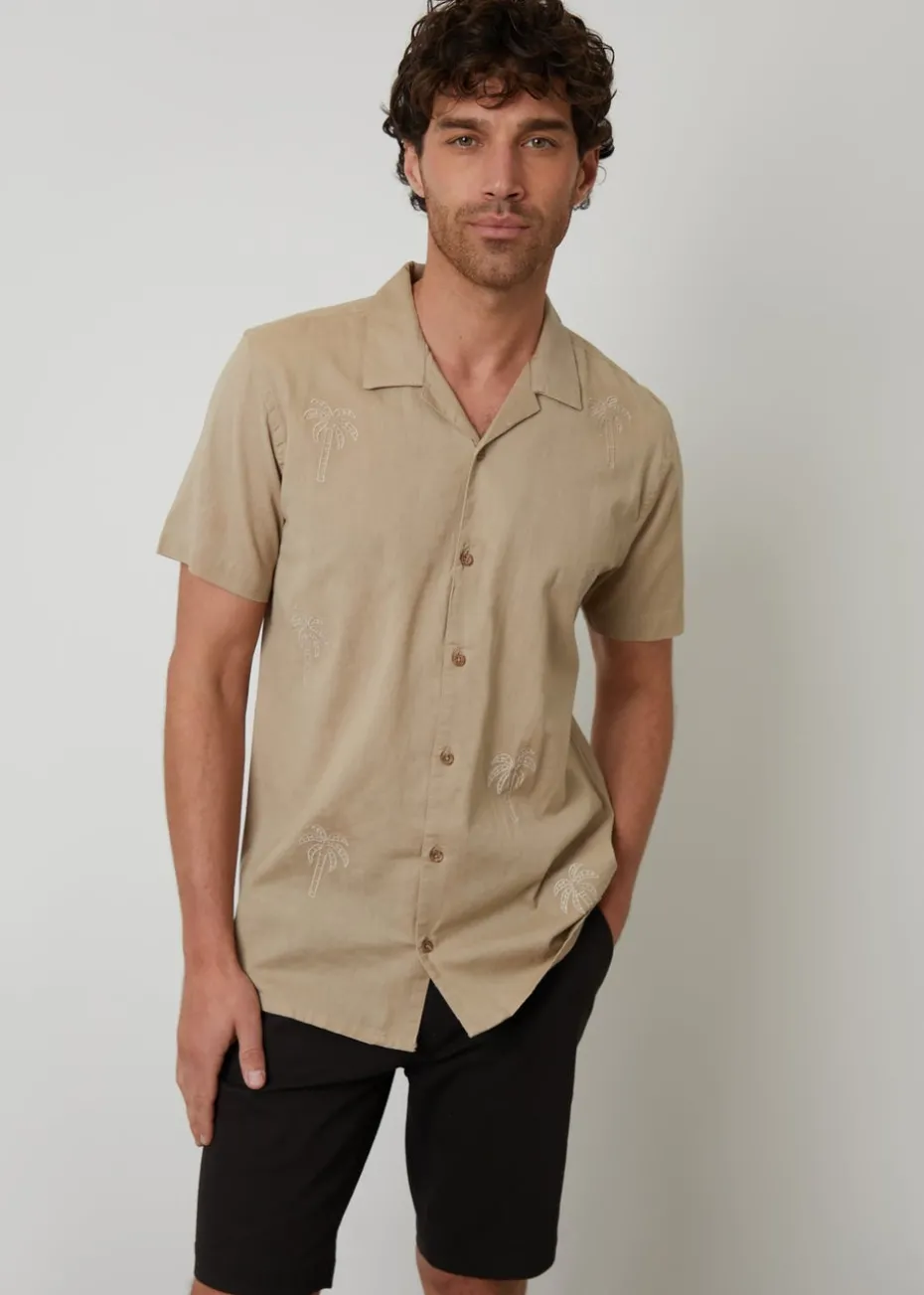 Threadbare Stone Linen Blend Palm Embroidered Short Sleeve Shirt