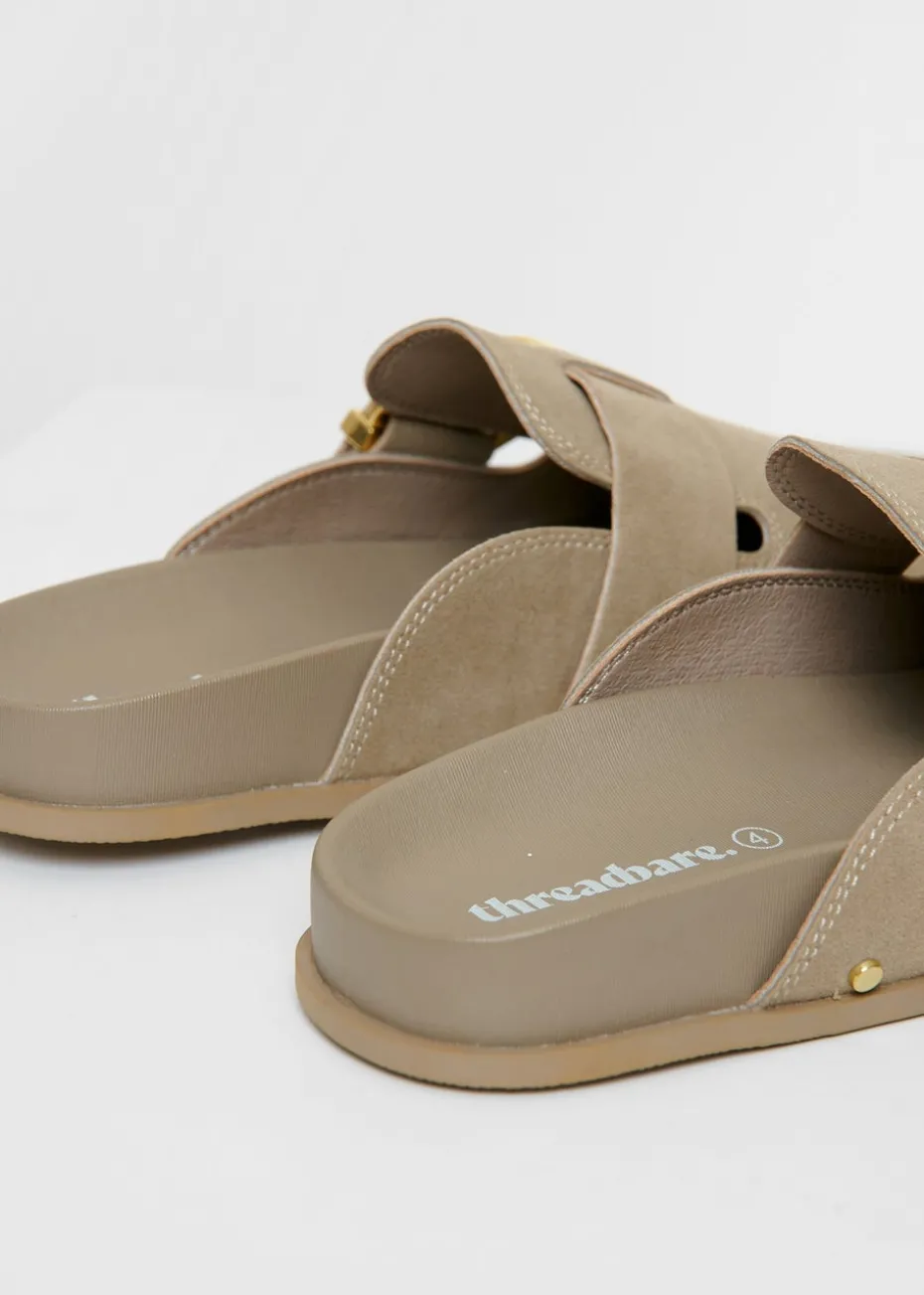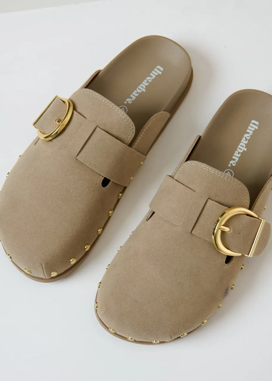 Step into effortless style with these chic slip-on mules from Threadbare. Designed with a timeless clog silhouette, featuring an open-back design for easy wear and statement gold buckle fastening. Metal stud detailing around the edge adds a contemporary edge, while the durable rubber sole ensures all-day comfort and support. The perfect transitional sandal alternative, style with a casual summer dress, or wear with our wide leg jeans and a lightweight cardigan in the spring.