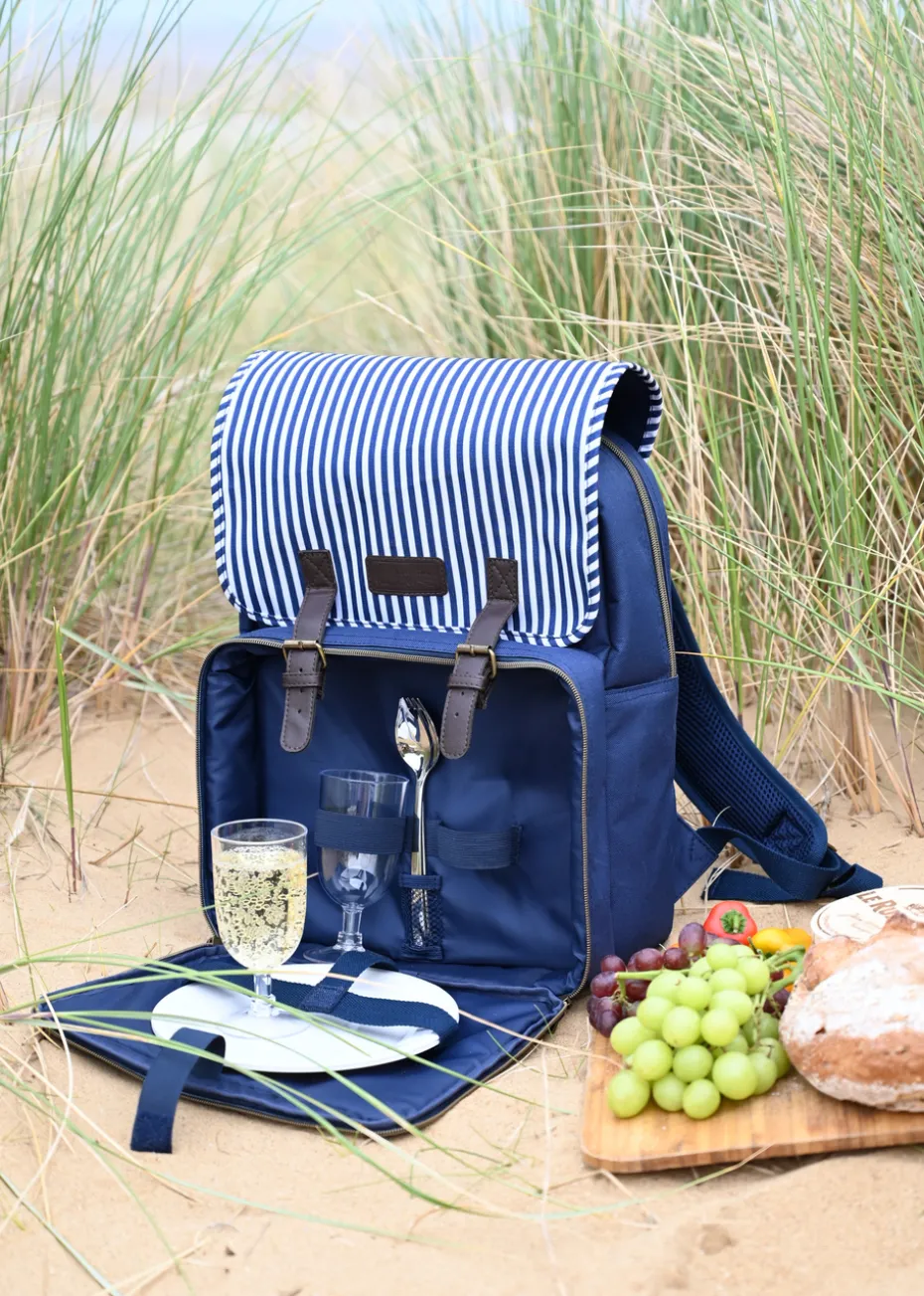 Are you and your partner planning a romantic picnic? Have everything you need for dinner under the sunset with the Three Rivers 2 Person Backpack! With its classic navy and white stripe design, you’ll be sure to turn heads at the park. This backpack comes with all the essentials for a perfect alfresco meal for two, including 2 acrylic wine glasses, 2 acrylic plates, and 2 sporks.