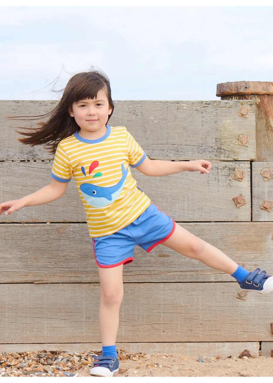 Splash! This short-sleeved organic cotton T-shirt features our rainbow-blowing whale on sunny yellow stripes. This is an easy, breezy summer style with its deep blue trim and neck poppers on smaller sizes – add a pair of our organic shorts or leggings to finish the look.