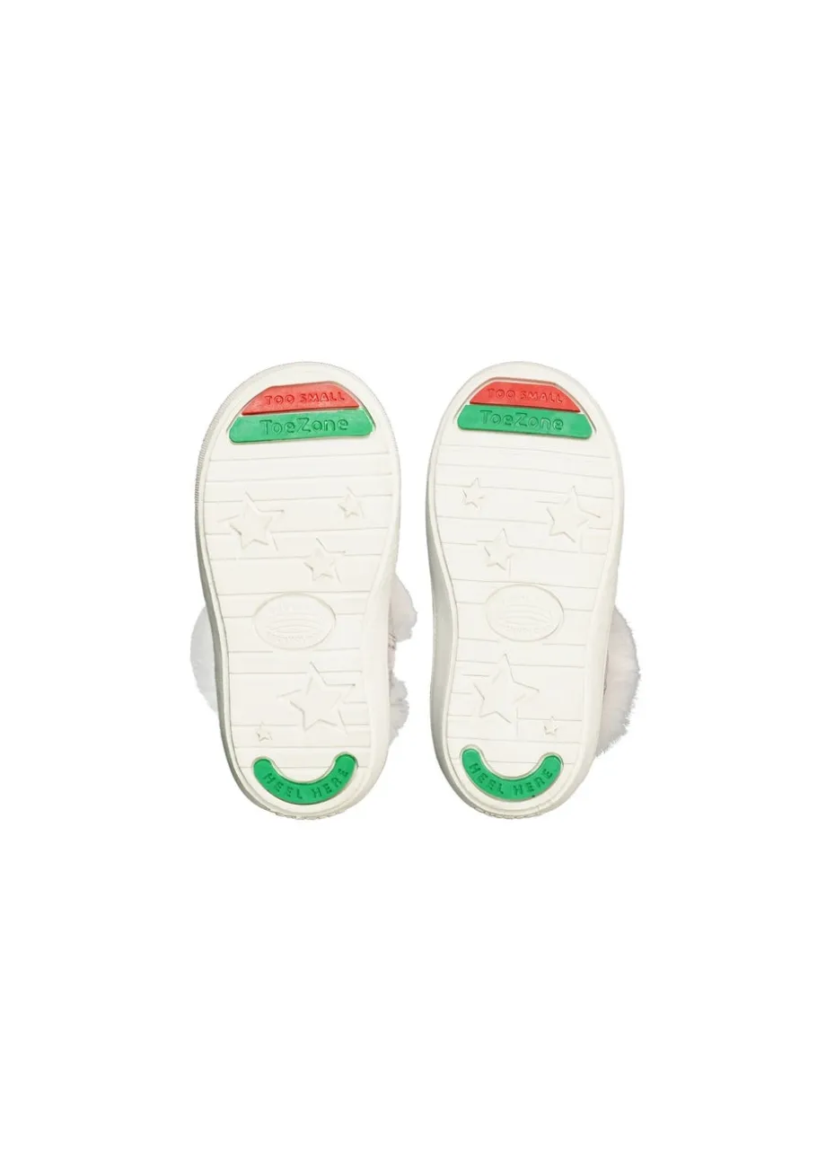 ToeZone Vienna Girls’ Pink Shimmer Fur Boot are packed with features to ensure comfort, durability and style, these boots are designed to be extraordinary. Here’s what makes them special: Suede Leather Upper: Lightweight, making shoes more comfortable. Leather Ortholite Insock: Offers exceptional comfort with every step. 3M Reflective: Enhances visibility and safety in low-light conditions. Easy Fasten Zip: Easy to adjust for a secure fit. Faux Fur Collar: Extra insulation, keeping children’s feet warmer, especially during colder months. Non-Slip: Ensures stability on various surfaces. Non-Marking: Prevents marks on floors, keeping them clean. Man-Made Outsole: Durable and provides excellent traction. Textile Linings: Environmentally friendly and keeps the shoes fresher for longer. Free Bag: Comes with free recycled tote bag. Material Composition: Upper: Leather Suede Linings: Textiles Sole: Man-Made Materials Additional Features: Check out the LEFT and RIGHT print on the insocks – super helpful for children learning to put their shoes on correctly. We recommend using our printable fitting guide unique to ToeZone before making a purchase to ensure the perfect fit. Receive a FREE drawstring bag with every pair!