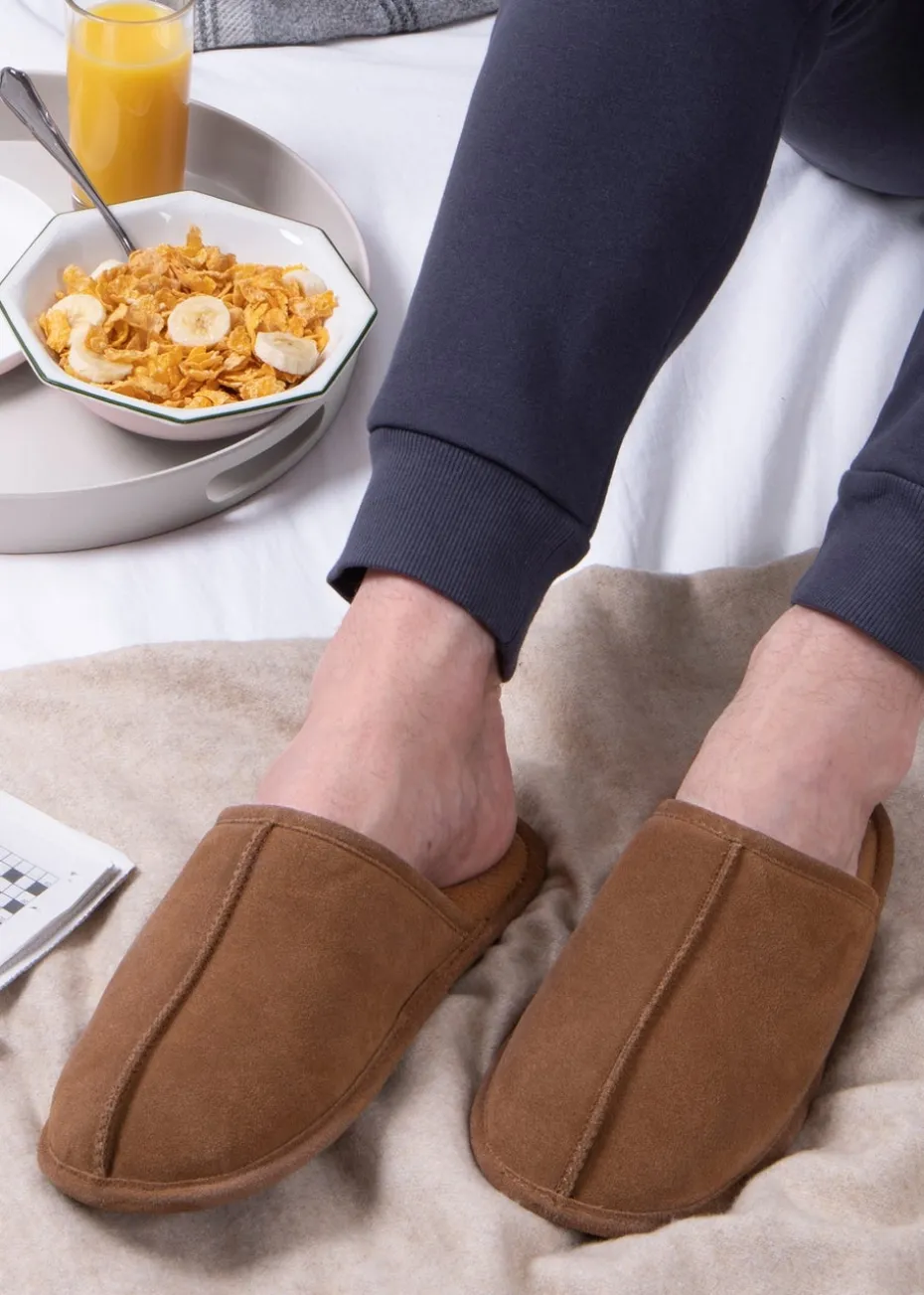 Our Isotoner Mens Real Suede Mule Slipper features our Memory Foam Cushioning, Faux Fur Lining with Suede Binding and a Durable Sole, finished with a Water Repellent Coating to protect your slippers from any accidental spillages.