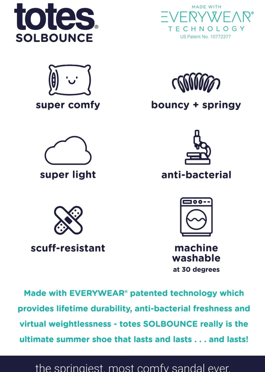 With eye-catching print options to choose from, our totes® SOLBOUNCE summer footwear range is seriously lightweight and really comfy! The Everywear™ technology provides a compression-proof insole so it’ll keep its shape even after thousands of hours’ wear and the soles are anti-bacterial for the freshest summer feet. Just perfect to pop in your suitcase as they can be folded, squashed and bundled and will always return to their original shape – put a spring in your summer step with totes® SOLBOUNCE !