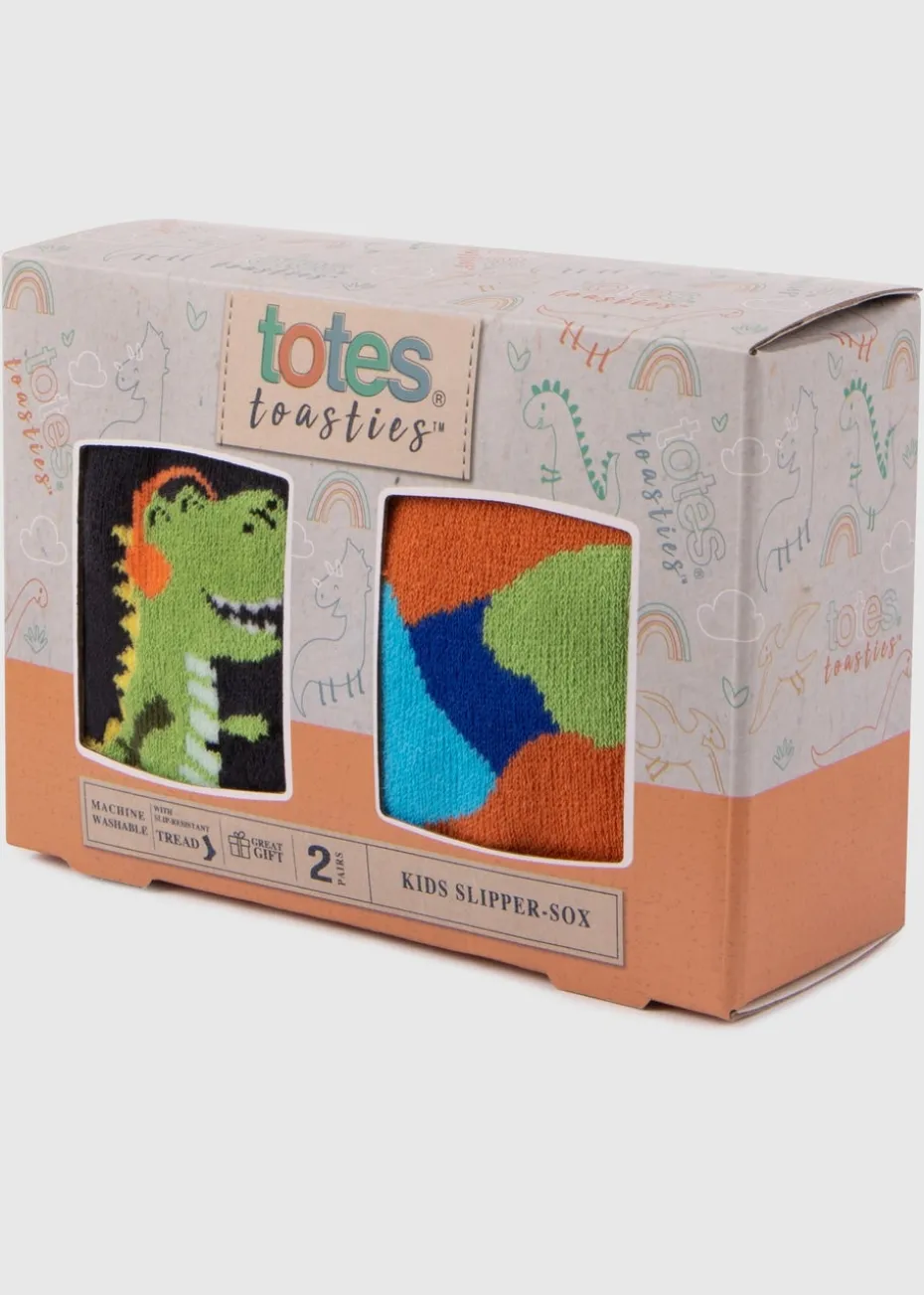 Rooooaaaarrrr – only friendly dinosaurs and monsters live in our lovely packaging! In Handy Twin Packs, choose between googly-eyed monsters and smiley Dinosaur/Bright Camouflage Designs – all on our totes toasties Terry Lined Slipper Socks with famous Slip-Resistant Tread.
