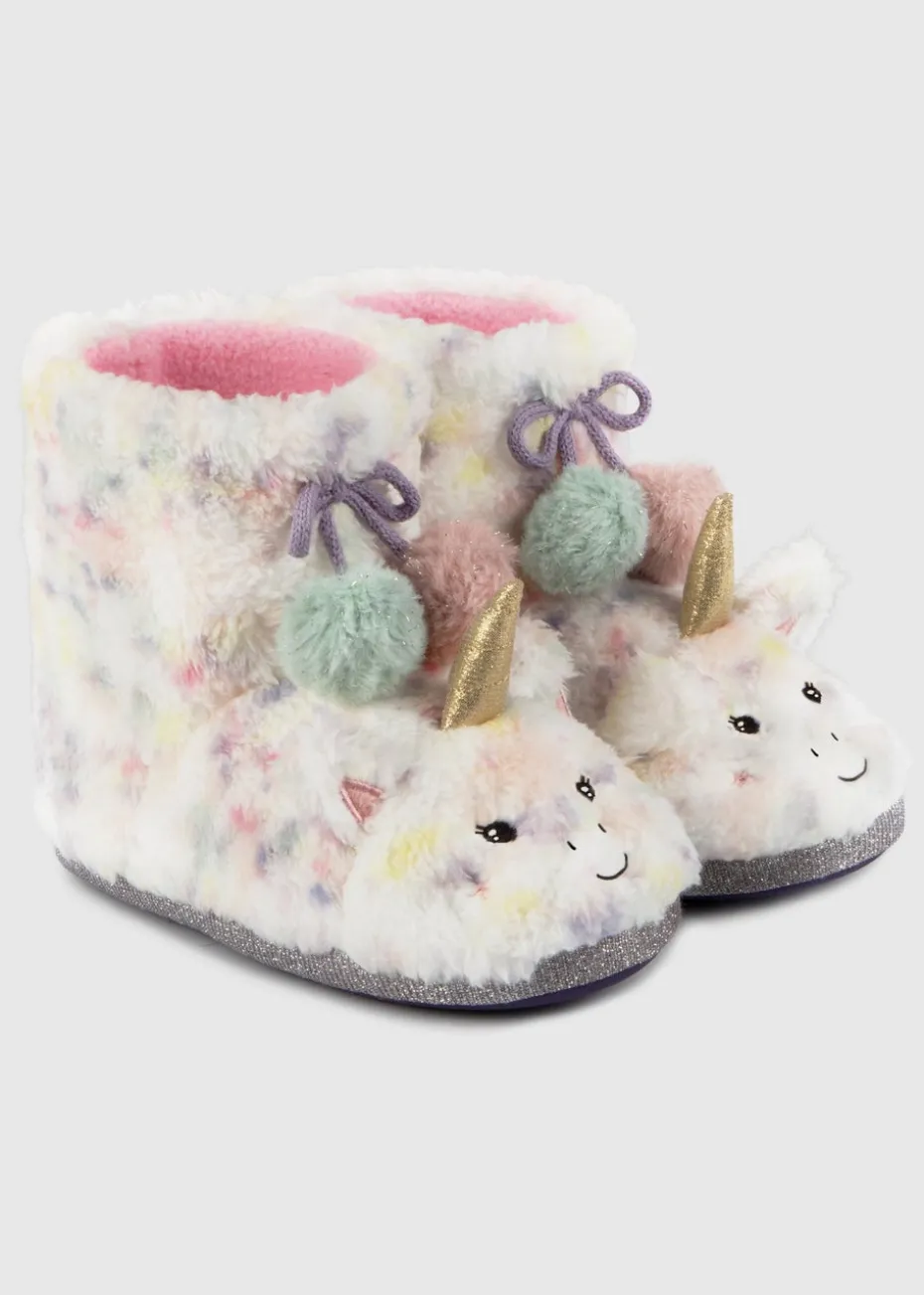 These adorable bootie slippers feature a magical 3D unicorn design with a fun pom pom trim, making them the perfect indoor winter footwear for little ones. The textured faux fur upper and warm, cosy fleece lining ensure comfort, while the durable textured sole allows for safe play. With a super glitter effect and a smiley face, these novelty unicorn slippers will whisk their imaginations away to enchanted lands. Plus, they’re machine washable at 30° for easy care and maintenance.