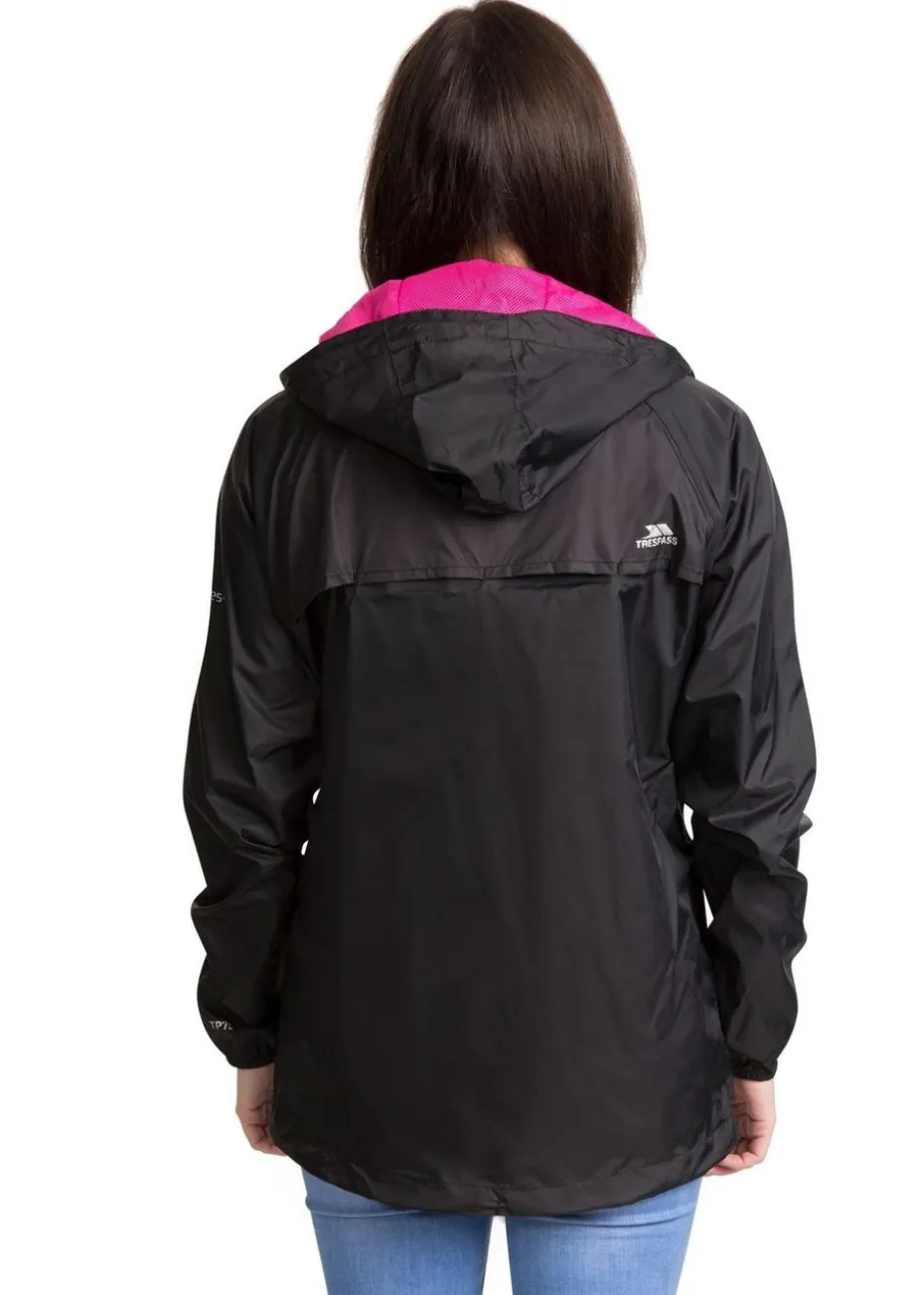 Shell jacket. Adjustable grown on hood. 2 zip pockets. Full elasticated cuff. Full length internal front storm flap. Drawcord at hem. Ventilated back yoke. Contrast low profile zips. Jacket packs into pouch. Waterproof 5000mm, breathable 5000mvp, windproof, taped seams. Trespass Womens Chest Sizing (approx): XS/8 – 32in/81cm, S/10 – 34in/86cm, M/12 – 36in/91.4cm, L/14 – 38in/96.5cm, XL/16 – 40in/101.5cm, XXL/18 – 42in/106.5cm. Please note: Designed for a relaxed fit