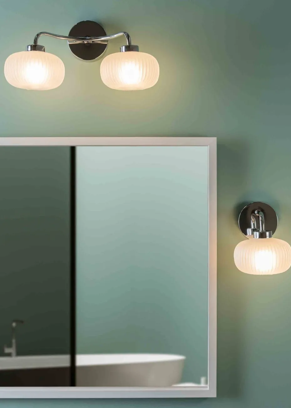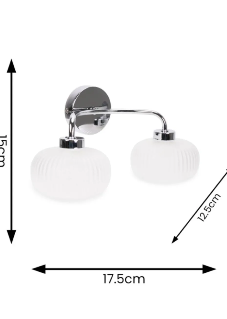 Illuminate your space with this two way wall light fitting. Suiting any living room, bedroom, bathroom or reading nook this dual wall light features statement metal in a chrome finish with frosted glass shades. The ribbed glass shades not only provide a stylish look but also diffuses the light softly, creating an cosy atmosphere. With a perfect balance of style and functionality, this light brings a touch of modern glamour to any space. Requires bulb with G9 fitting. This light is IP44 rated making it suitable for bathrooms.