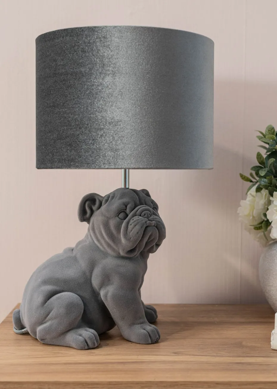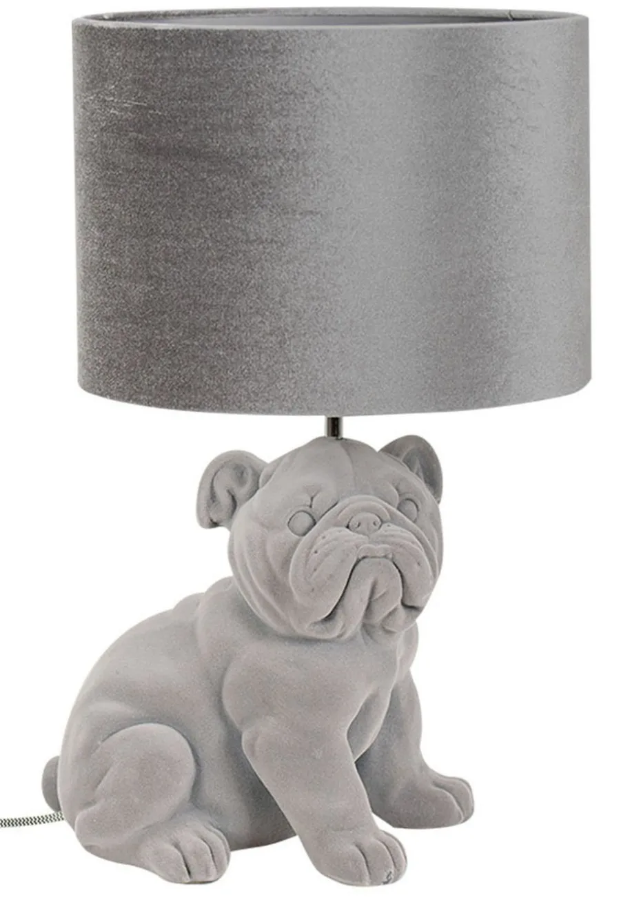 Add some character and charm to your home with this bulldog table lamp. Complete in a grey velvet finish with a matching drum lampshade, this lamp is sure to be a showstopper that will brighten any room. The in-line rocker switch provides convenient control, making it easy to illuminate your space. This table lamp is a unique piece of lighting that will add a touch of personality and style, transforming your room in seconds. Requires 1 x LED 4W ES E27 bulb (not included).