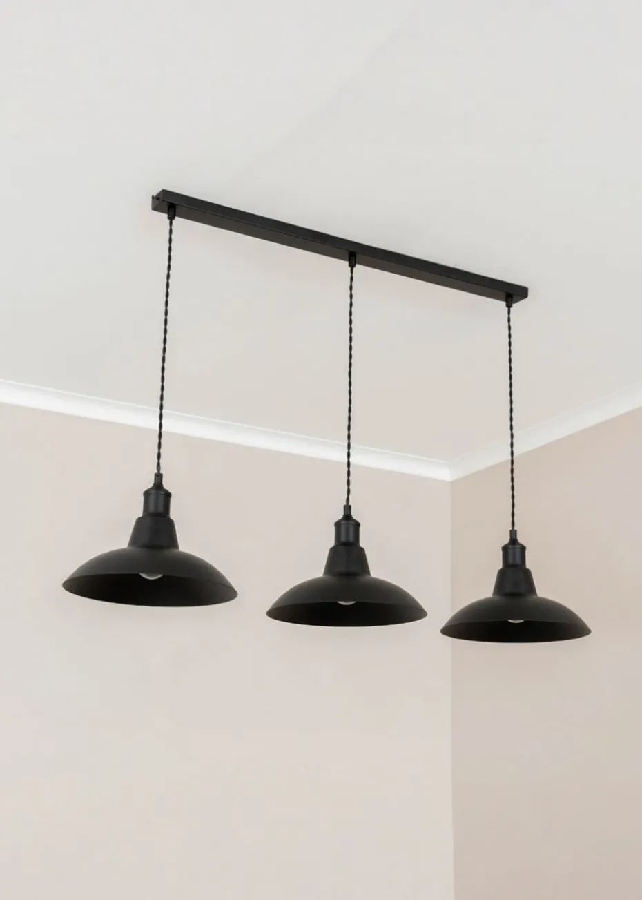 Brighten up your space with this matte black 3-drop bar E27 lamp holder. Sleek, sturdy, and effortlessly chic, it features 3 black metal dome shades that offer an edgy, contemporary touch. Easy to install, just add 3 of your favourite bulbs and let it shine. Whether you’re creating a stylish loft vibe or a warm, rustic atmosphere, this light fixture will bring charm and character to any room. Caution: may lead to constant admiration from your guests!