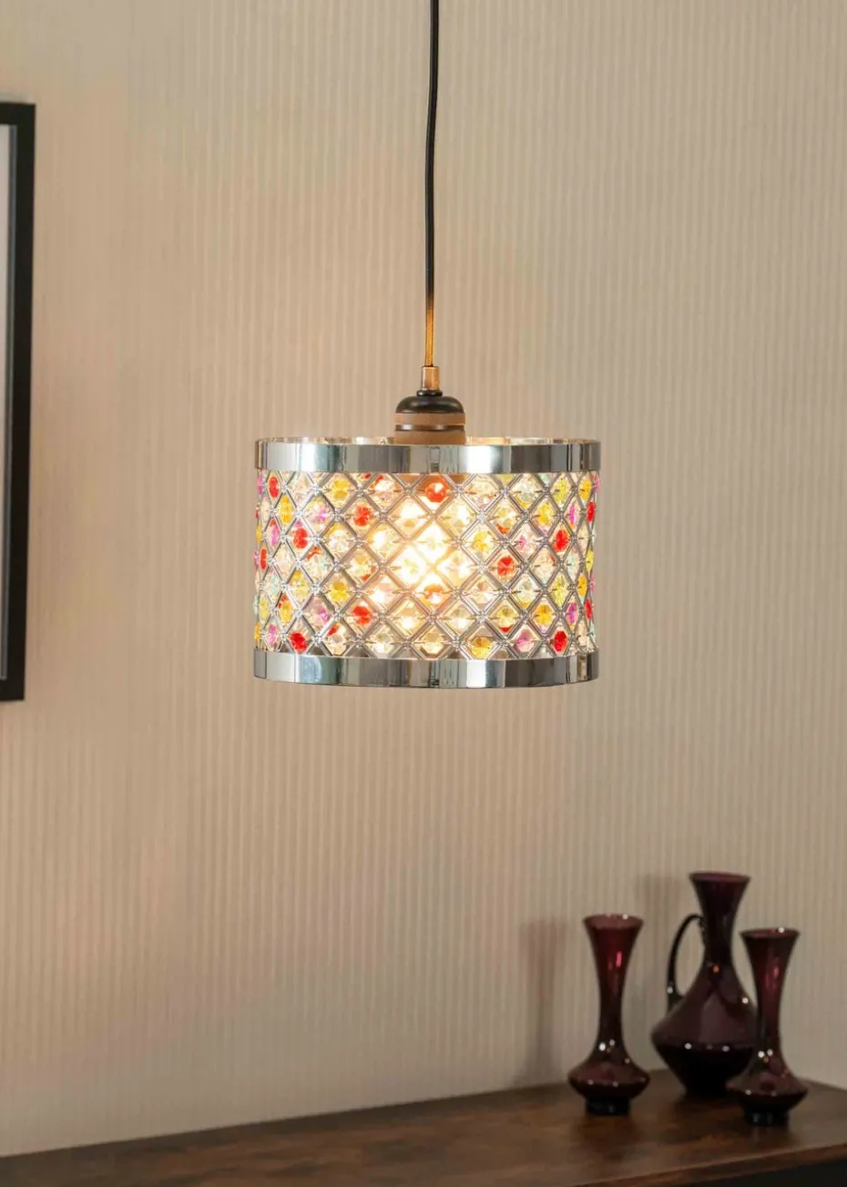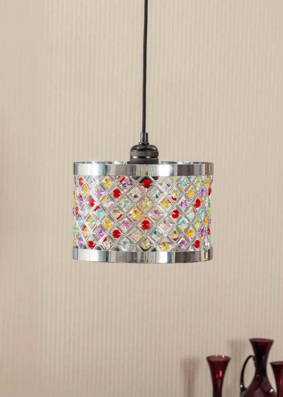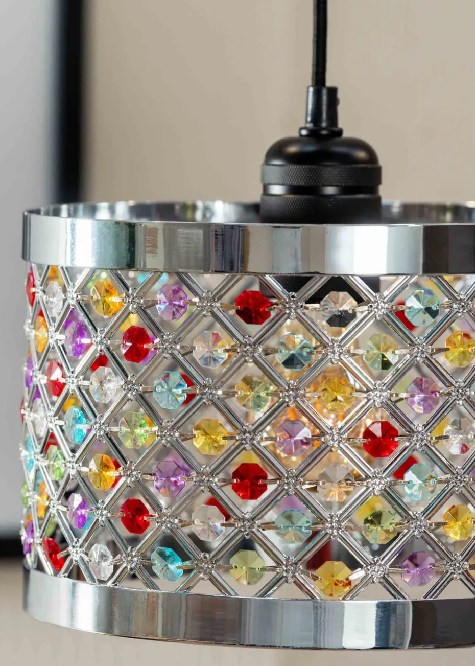 Experience modern elegance with this jewel detailing lampshade. This drum shade is the perfect statement piece for your home. The acrylic jewels add a glamourous and sophisticated feel whilst the intricate cut out detailing allows the light to disperse evenly around the room. Easy fit pendants are ideal for a quick style change without needing an electrician. This pendant looks just as effective switched off as it does on. Requires bulb with B22 / E27 fitting