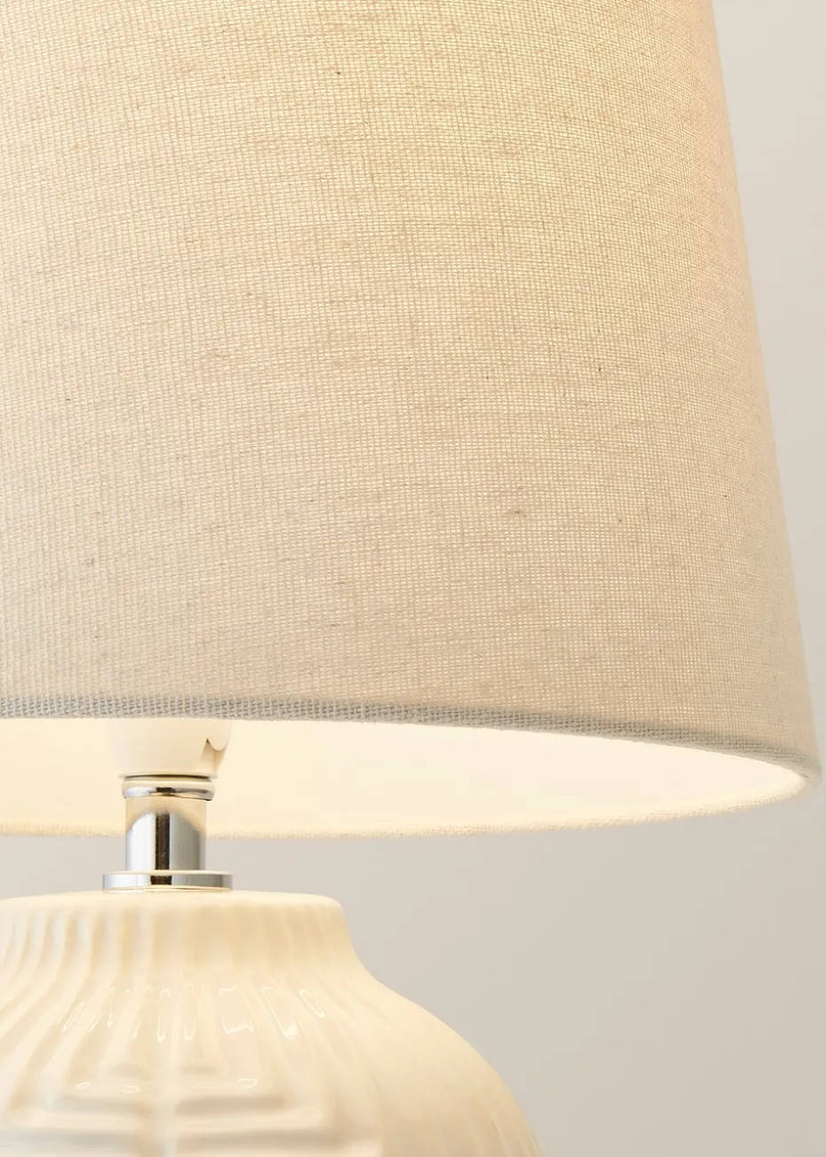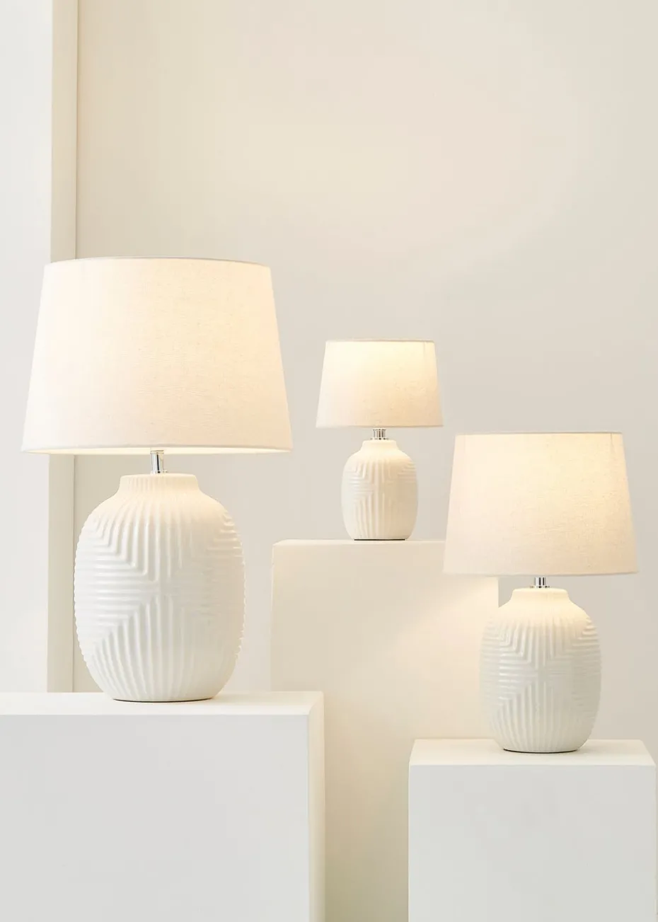 Introducing Harrison, the table lamp that brings effortless style to any room! With its glossy white finish and geometric ribbed design, it’s a real statement piece. The colour-matched fabric cable keeps things coordinated, while the brushed chrome cap offers a modern edge and levels up the quality. Topped with a soft linen shade, Harrison combines cosy lighting with contemporary flair. Available in small, medium, and large, it’s the perfect choice for any space looking for a little extra glow.