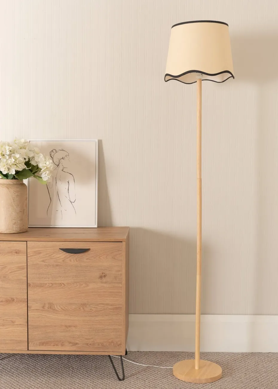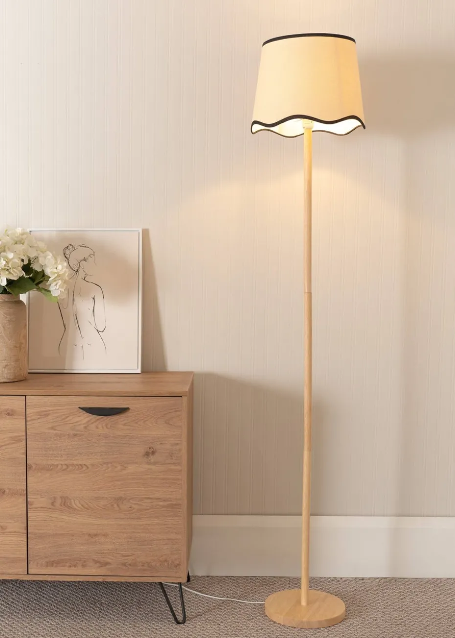 Introducing the light your modern makeover has been missing, the Heather wooden stem floor lamp is effortlessly elegant and super stylish. Finished in light wood, this sleek lamp fits into a huge variety of interior styles. It’s topped with a soft natural colour scalloped shade which has a trim in either black, rust, or white and there’s a 1.8m cable running from plug to lamp. The lamp has an in-line foot switch, too, so it’s user (and back) friendly!