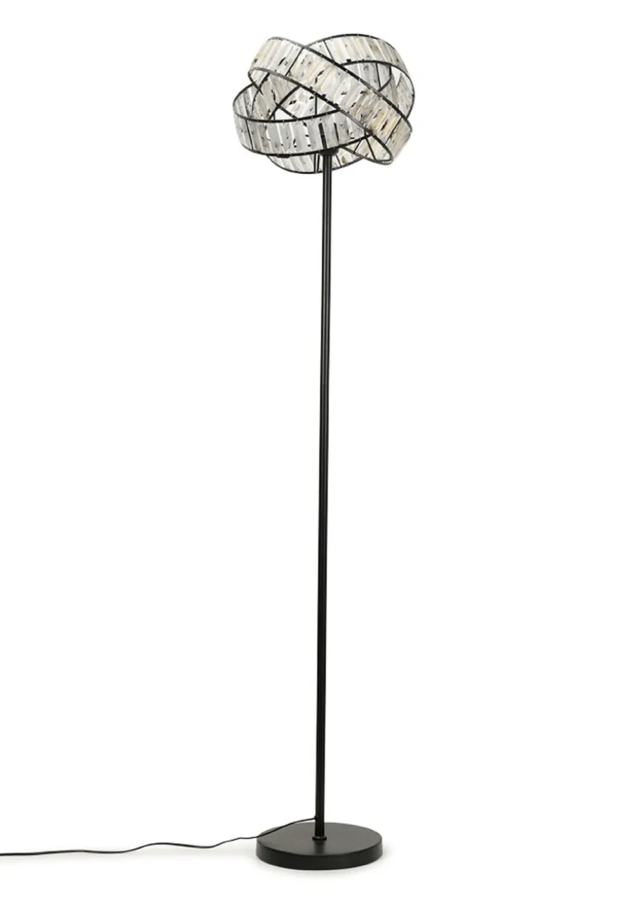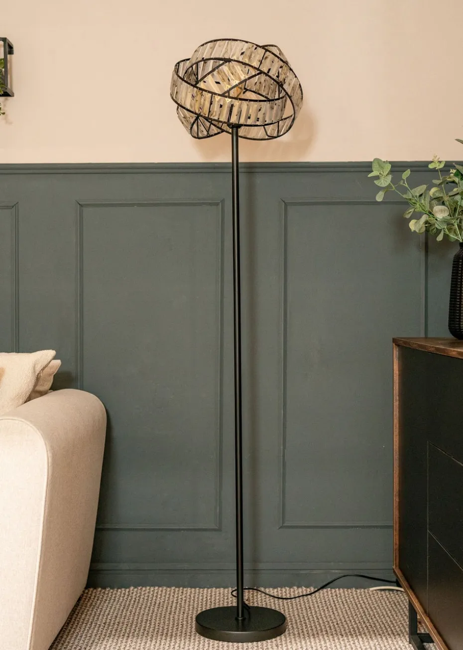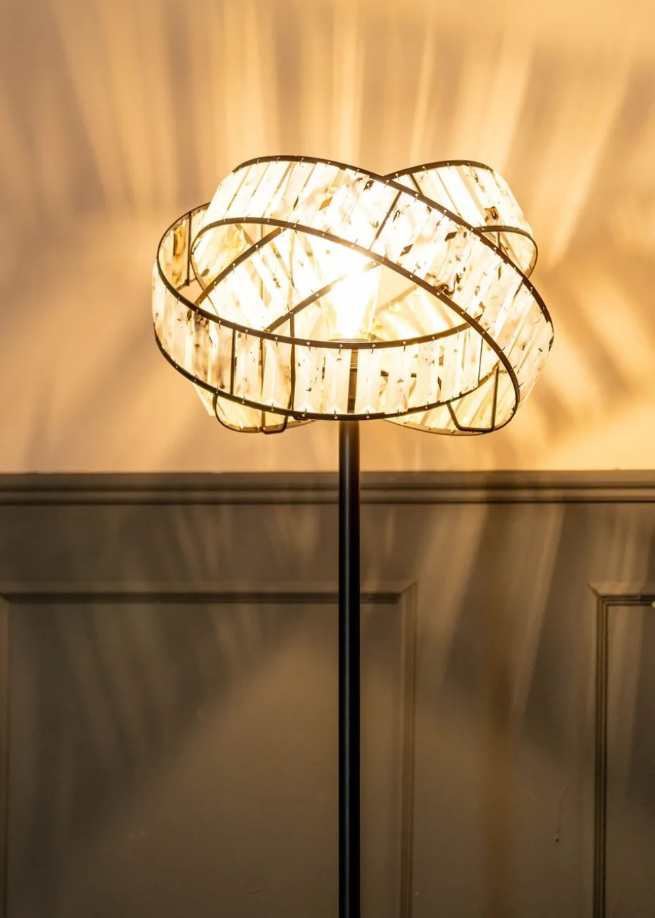 Designed with a chrome stand this floor lamp features tortoise design acrylic jewels embedded in a black trim intertwined shade. The intricate detailing is perfect for adding a luxurious feel to your home. It emits a soft, ambient light, perfect for creating a warm atmosphere in your home. Transform your room easily with this elegantly crafted lamp. Requires 1 x LED 6W ES E27 bulb (not included).