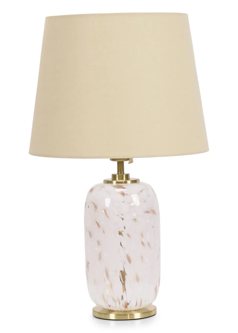 The India white confetti glass table lamp takes the simplicity and timelessness of a classic lamp sillhouette, and injects some fun with confetti into the glass. Complete with delicate gold detailling to really set off the style, and paired with a natural beige fabric tapered lamp shade, making it perfect for any home.
