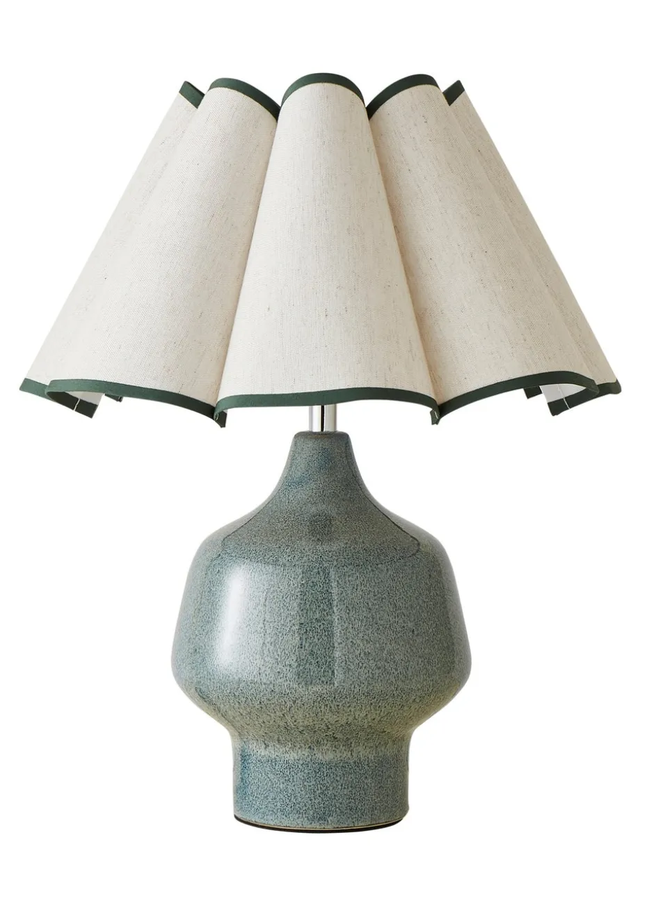 Introduce elegance to your living space with this green speckled table lamp. Featuring a ceramic base with a scalloped edge fabric lampshade in a natural finish with a matching green trim. This on-trend lamp is perfect for transforming your room in seconds. The in-line rocker switch provides convenient control, making it easy to illuminate your space. Requires 1 x LED 4W SES E14 bulb (not included).