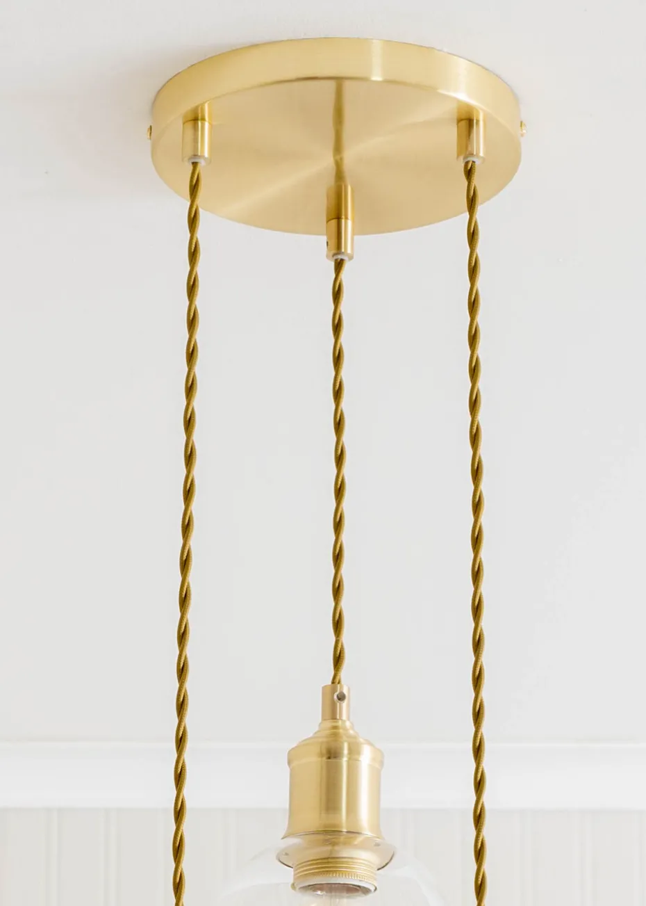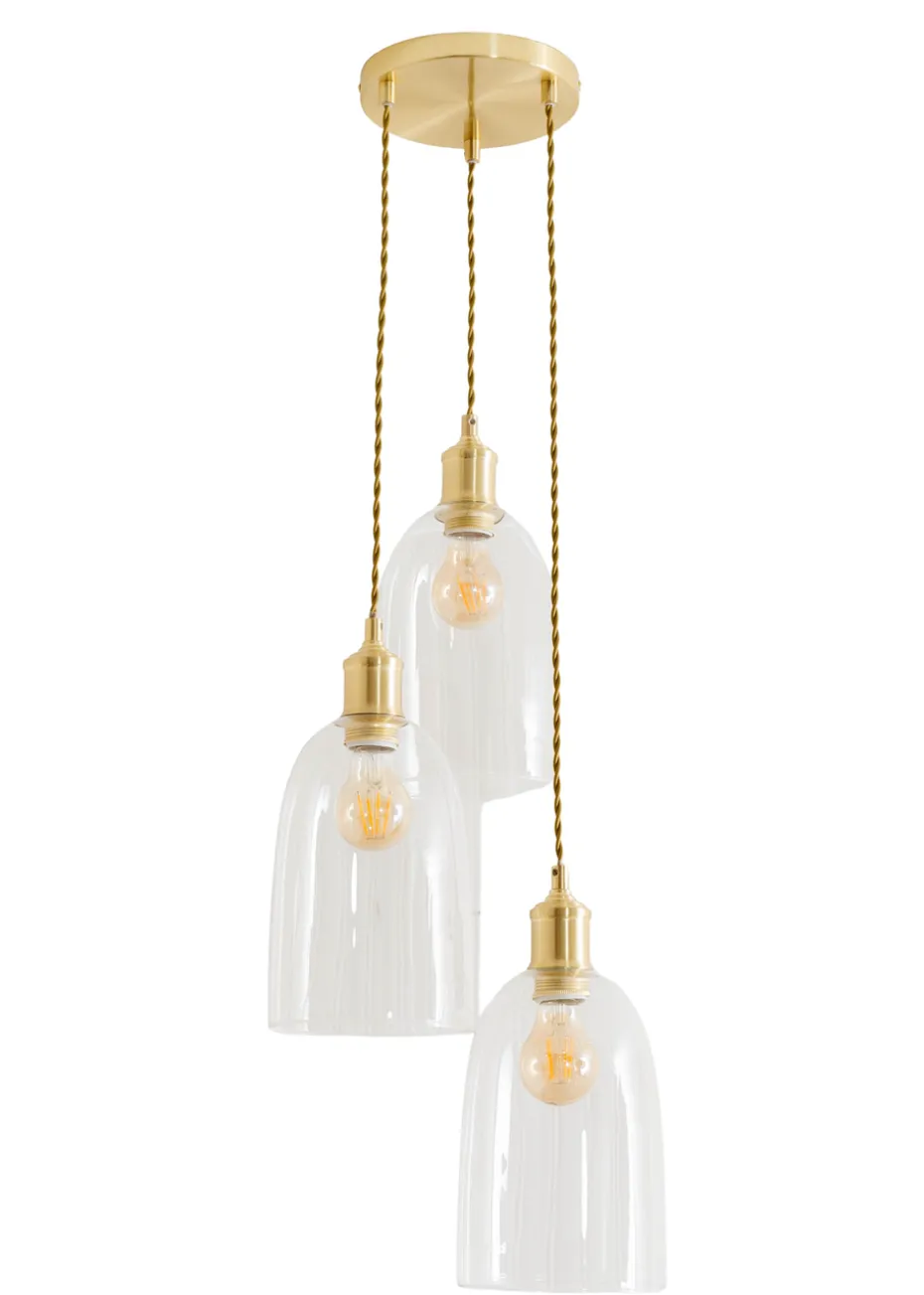 Transform your space with this brushed gold 3-drop cluster ceiling light, featuring three elegant Kira glass dome shades. The light shines beautifully through the glass shades, while the brushed gold finish adds sophistication. Whether you’re entertaining guests or enjoying some quiet time, this light brings effortless style to any room. Ideal for kitchens, dining areas, or any space that needs a little extra shine. Caution: may cause uncontrollable admiration from guests!