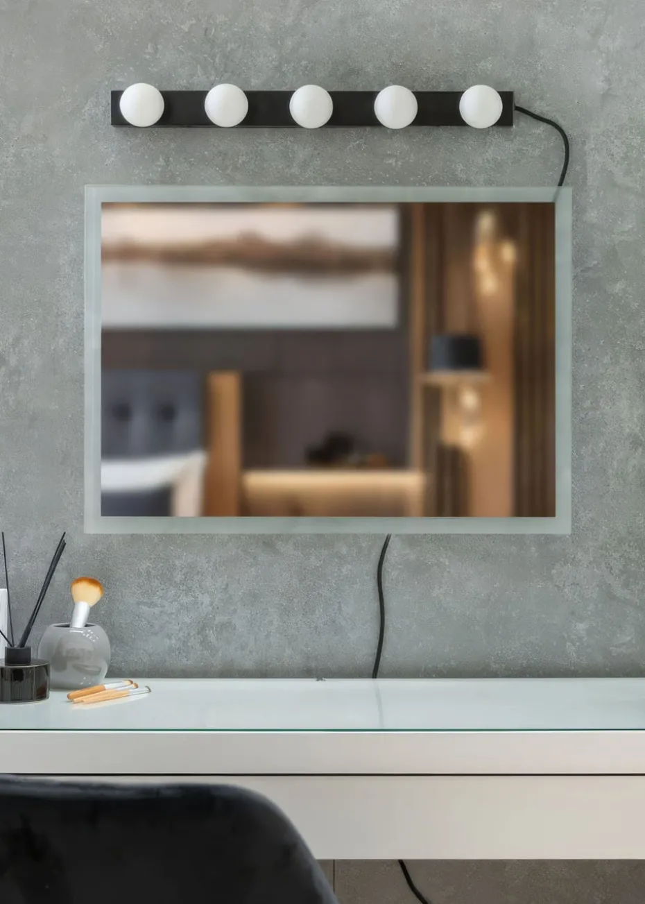 Add a touch of Hollywood glamour to your home with this five way wall light. Featuring a metal bar with five opal glass globe shades. This light is designed to create bright and practical illumination for bedrooms, dressing tables, above vanity mirrors and other living areas. The plug-in design means it can be installed in seconds with no need for an electrician. This simple yet stylish light makes a great gift for your loved ones, the perfect light for make up application and skincare. Requires 5 x LED 3W G9 bulbs (not included).