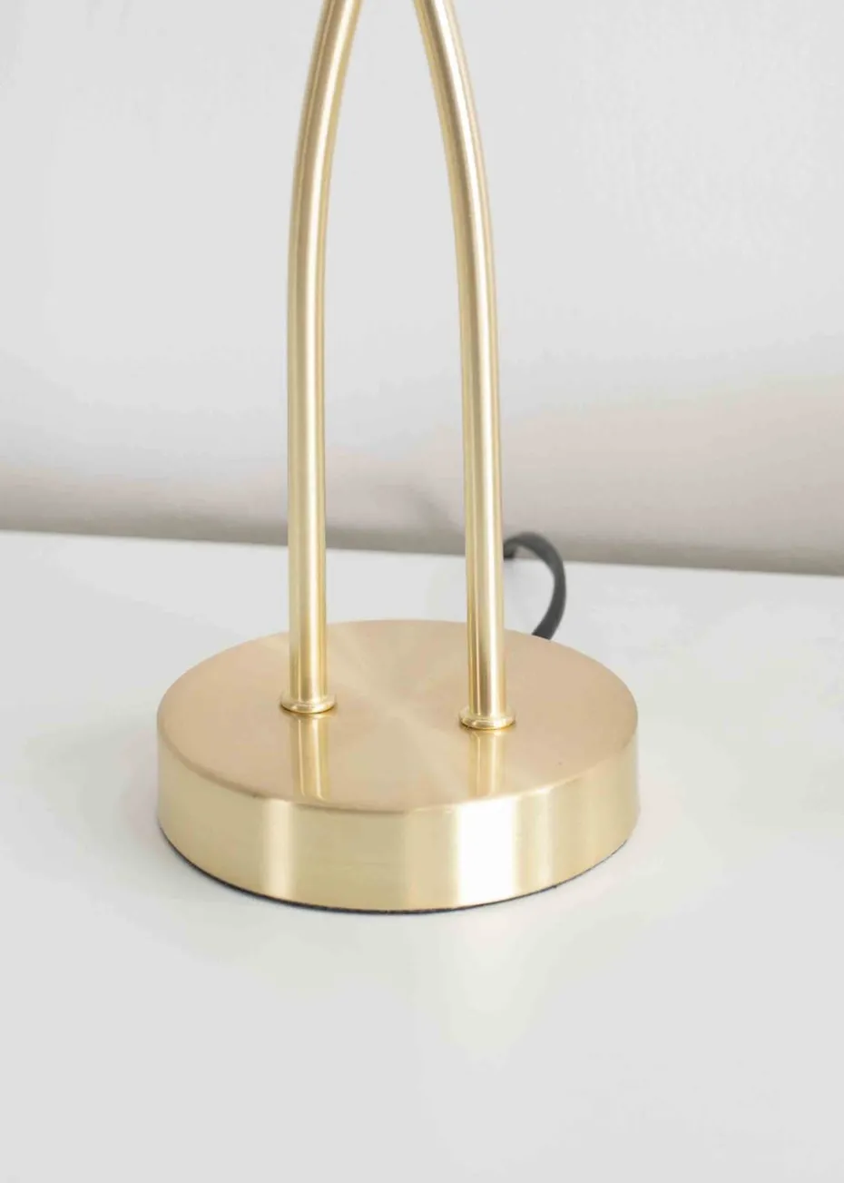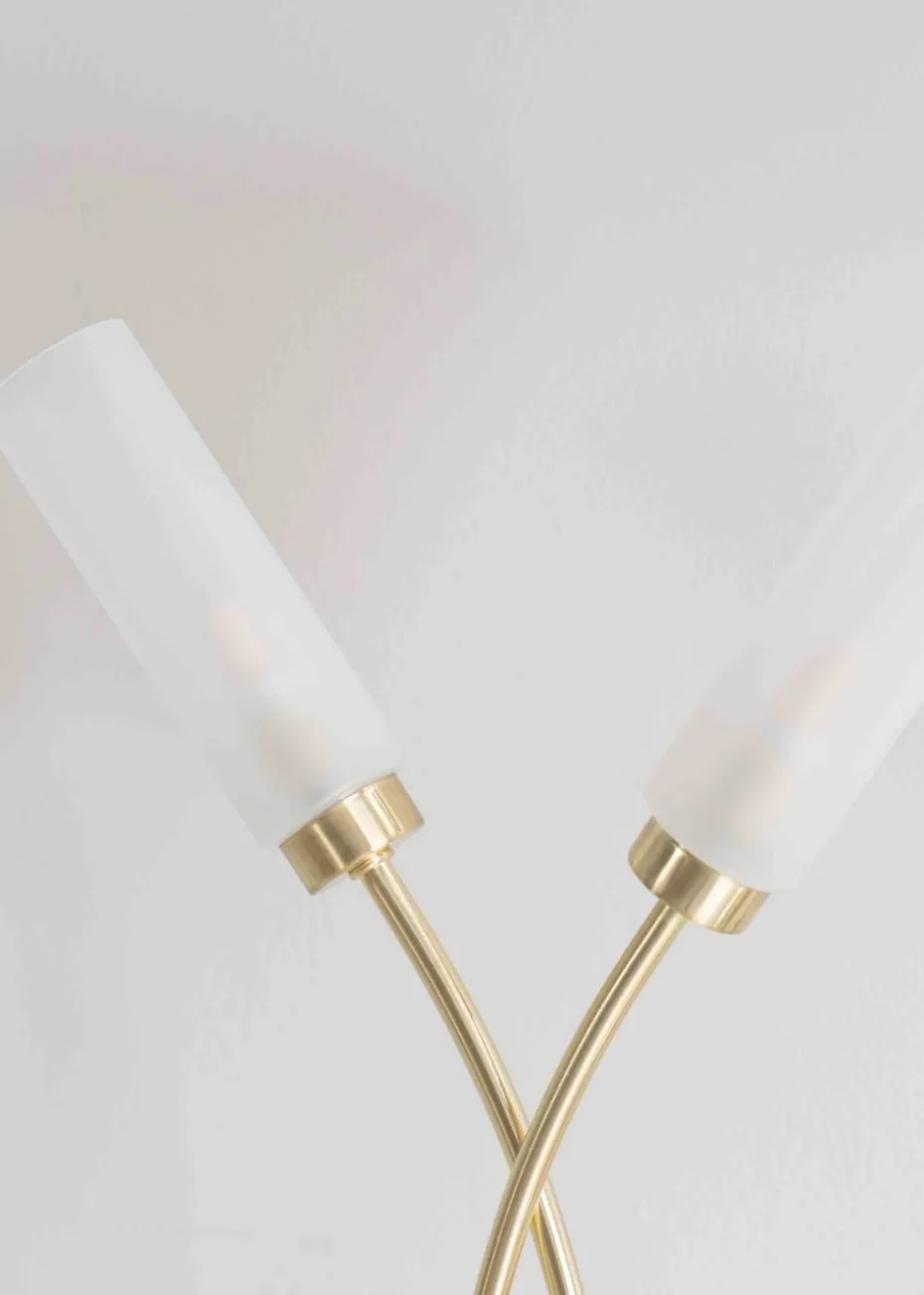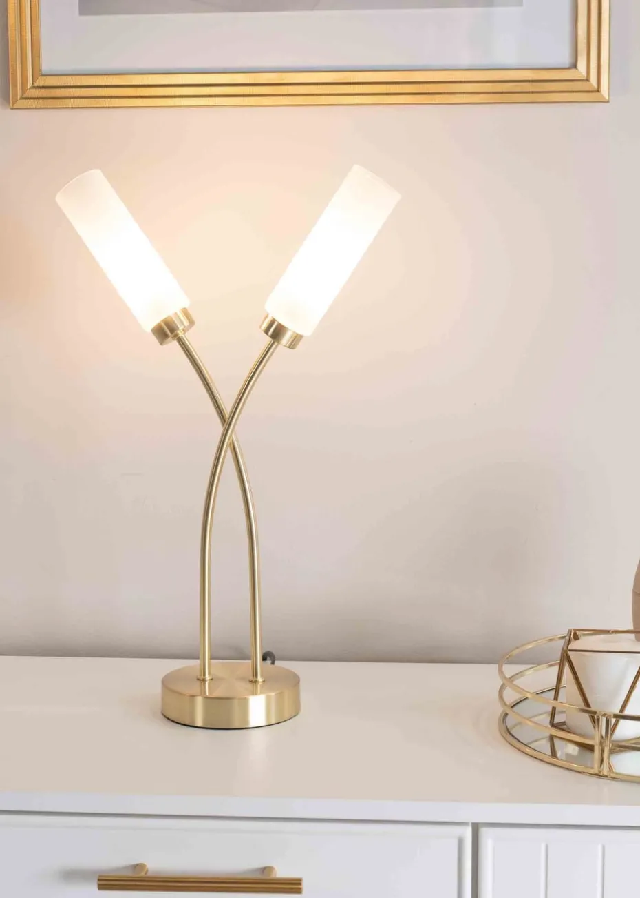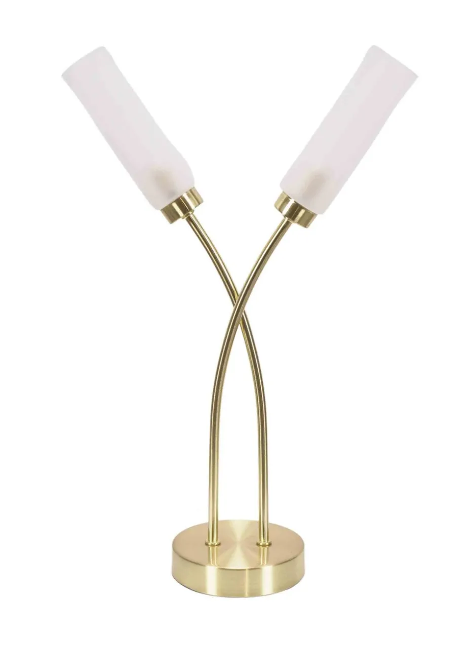 The Maya two way table lamp in brushed gold is a modern table lamp with two crossing stems with tubular shades. The perfect addition to any side table. Requires bulb with G9 fitting