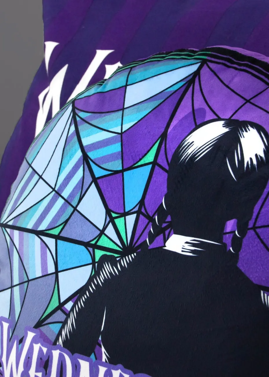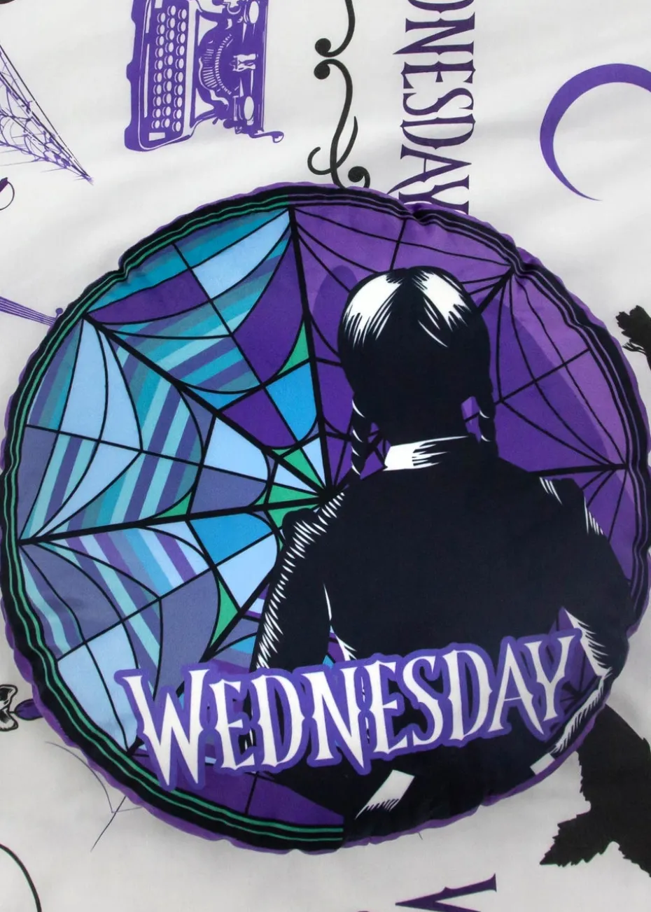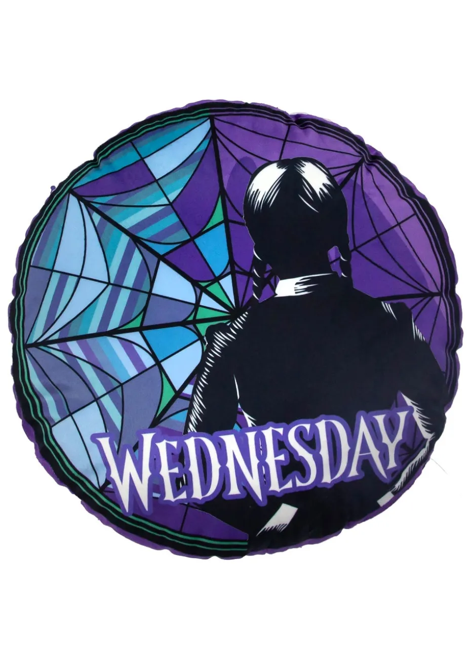 Perfect for members of your own Adams Family, this officially licensed Wednesday shaped cushion is super comfortable and makes for a great gift. Based on the stained glass window from Netflix’s Wednesday series, this circular shaped cushion is a great accessory for a bedroom, couch or sofa. The circular shaped cushion features Wednesday Adams gazing out of the her half of the stained glass window from her room at Nevermore school, coloured with gothic blues and purples, and with the Wednesday logo. The reverse side features the stained glass window with the Nevermore Academy laid over the top. Perfect as a present to brighten up a child’s or teenager’s bedroom, it’s packed with padding to support them when they’re gaming or writing in a chair, and comfortable enough to snuggle up on a sofa with on movie night. The cushion measures approximately 40 x 40cm, and is perfect for any Wednesday fan. This shaped cushion makes for a perfect companion accessory to our official Wednesday bedding set and fleece blanket.