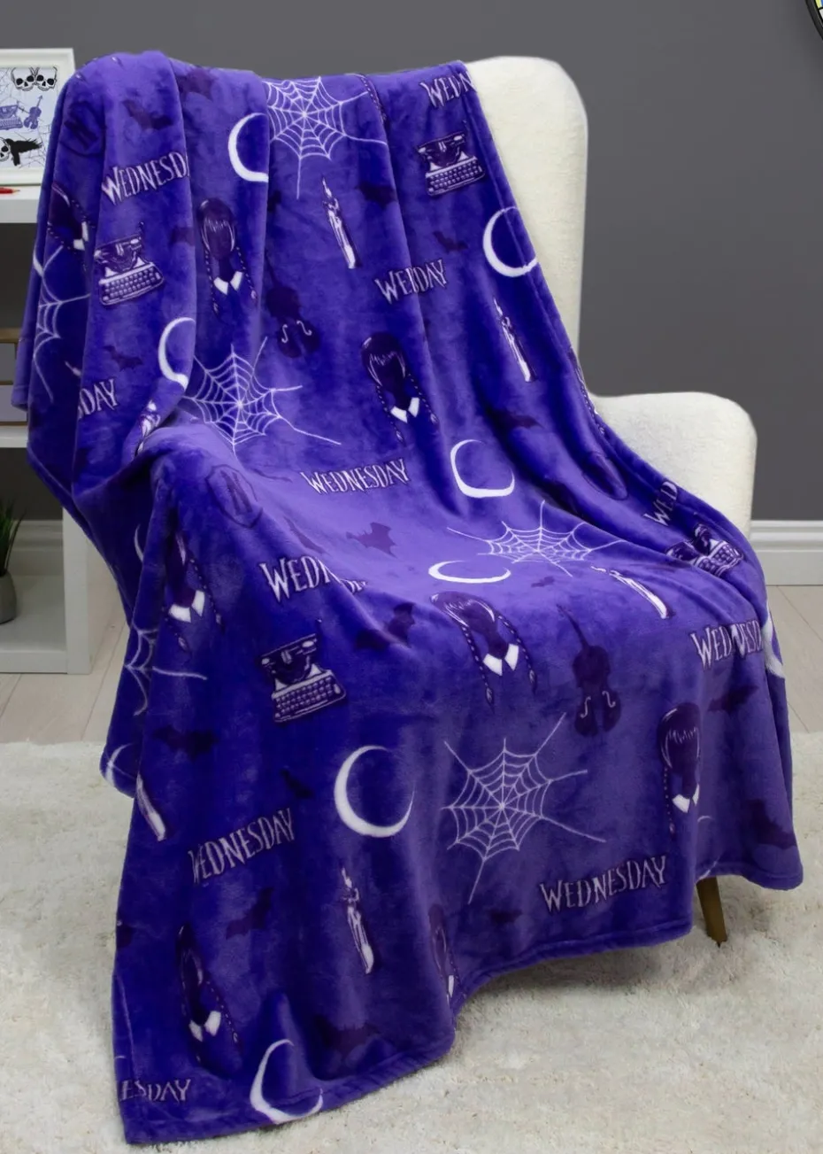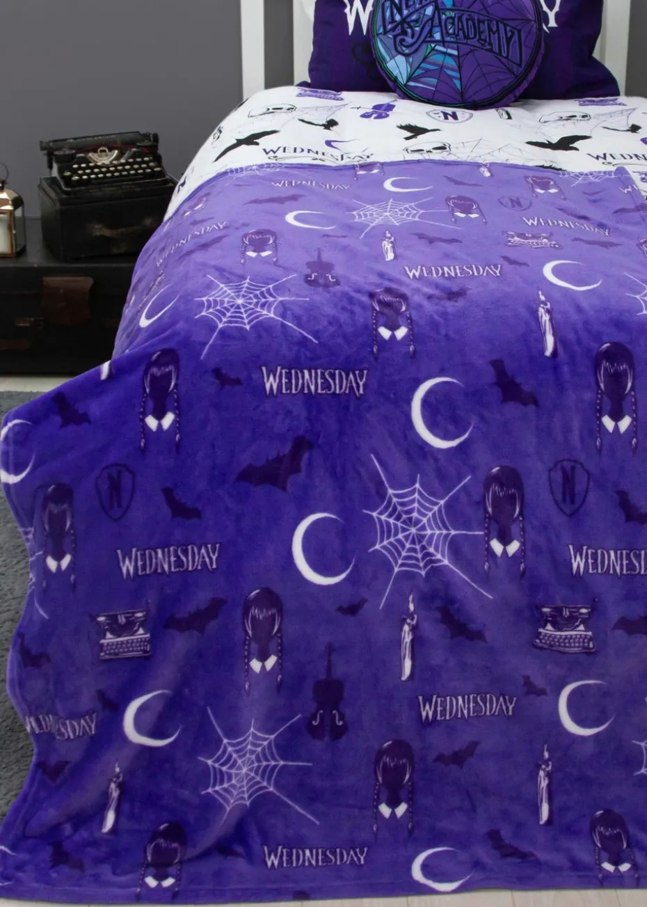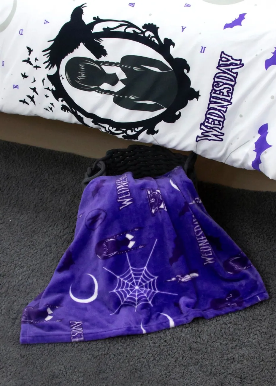 Perfect for any member of your own Adams Family, this officially licensed Wednesday fleece blanket is ideal for bringing some goth chic to your home. Featuring a repeated pattern of Wednesday, bats, cobwebs, the Nevermore school crest, and Netflix’s Wednesday logo, set on a gothic purple background. Great all around the house, either as an extra layer in bed, lazing on the couch watching a film on family movie night, keeping yourself comfortable when gaming in a chair, keeping warm while doing homework, or as an extra layer when out enjoying the garden. The Wednesday fleece blanket is lightweight and folds up to a compact size, making it great for car journeys, travel, and holidays, whenever you need to wrap up warm! This large fleece blanket measures 100 x 150cm, plenty big enough to keep you covered up, or act as a throw at the end of a bed. Made from soft strokable textured polyester, this fleece blanket is machine washable, so it’s easy to throw in to a wash to freshen up if there’s any spills or accidents, and tumble dryer safe to quickly dry ready to be used again.