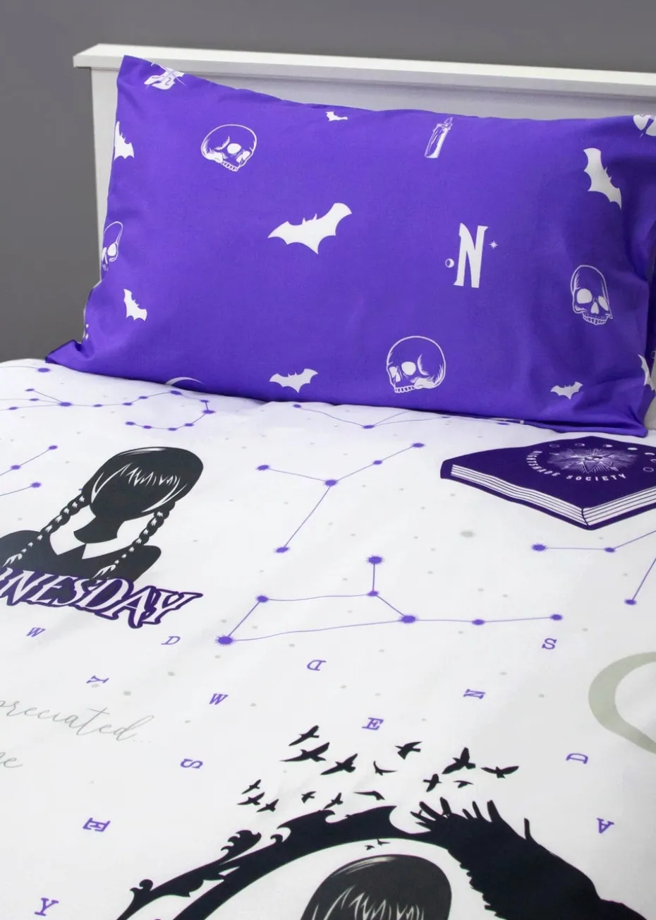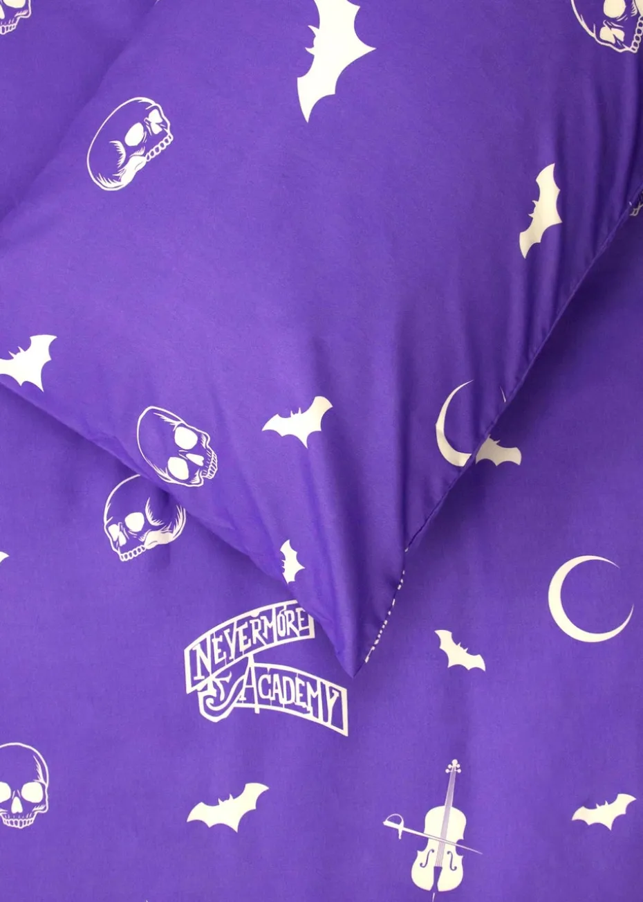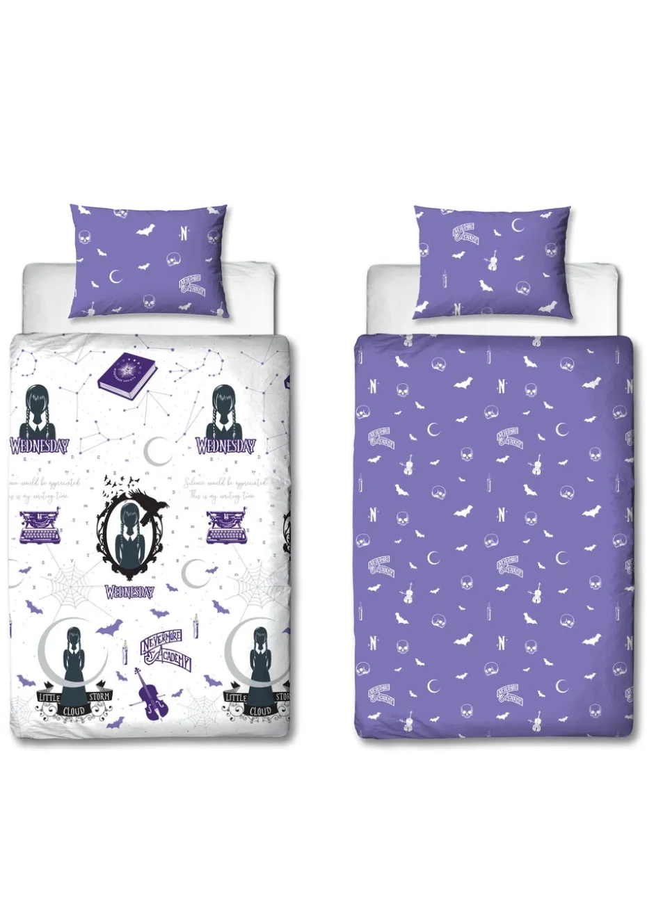 Perfect for any ‘little viper’, this officially licensed Wednesday bedding set is ideal for bringing some goth chic to a bedroom. The bedding set is designed single beds, and includes a reversable duvet cover and a pillowcase, so you can easily freshen up the look of your child’s bedroom. The front side of the duvet cover features a repeating pattern of Wednesday Adams in a picture frame with a silhouette of a raven, Wednesday with the messaging ‘Little storm cloud’, the Nevermore school logo and Wednesday’s cello and typewriter, set on a white background. The reverse side features a repeating pattern of skulls, bats, and the Nevermore logo on a purple background, with matching pillowcase. The bedding is made from recycled materials, and printed to a high standard. Made from a cotton polyester blend, the bedding features popper closing so it’s easy to remove and wash. The duvet cover and pillowcase are machine washable, and tumble dryer safe at a low temperature. Designed for single beds, the duvet cover measures 135 x 200cm, and the pillowcase is a standard UK size of 74 x 48cm