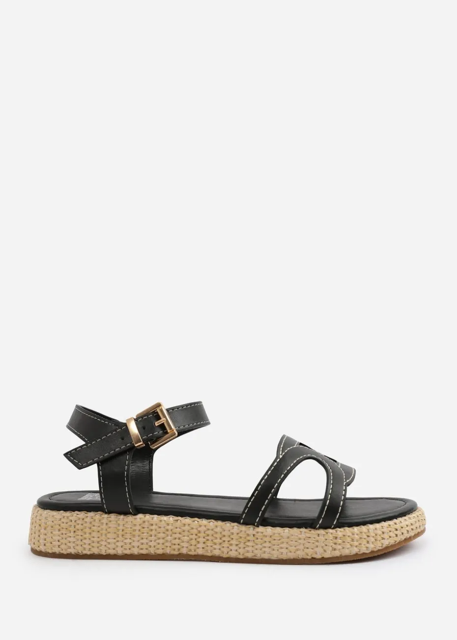 Where's That From Black PU Sofia Wide Fit Flatform Sandal