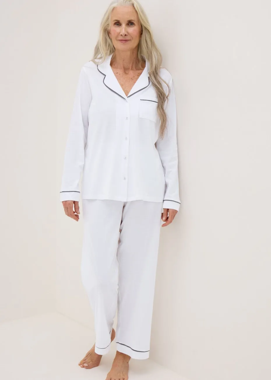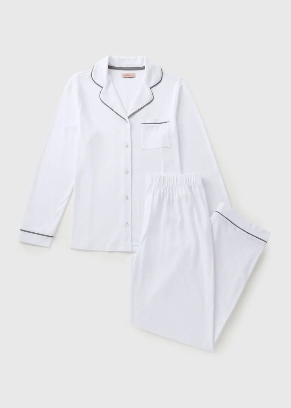 Complete your night time wardrobe with this relaxed, button-through shirt pyjama shirt. Cut from 100% cotton material, it’s perfect for any a cosy and comfortable night sleep. Finished with a flattering collar and long sleeves and paired with the matching full length bottoms with elasticated waistband, this pyjama set adds a traditional and comfortable touch of style to your night time wear.