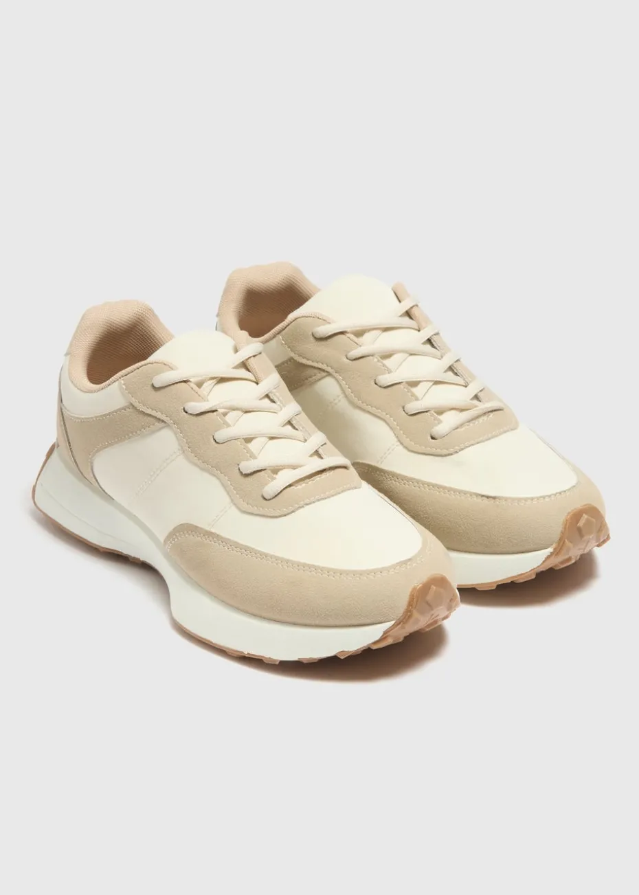 A must have in your wardrobe, our white retro runner trainers will have you sprinting towards style! With a white and cream colour palette, these trainers are perfect for everyday wear with a lace up design that will create a secure fit. These runner trainers not only support your feet but also ensure a fashionable look for wherever you go. Dress up your athleisure with these trainers, sports leggings, and an oversized t-shirt for a sporty-chic look or go for a relaxed weekend vibe by teaming them with joggers, an oversized hoodie, and a baseball cap.