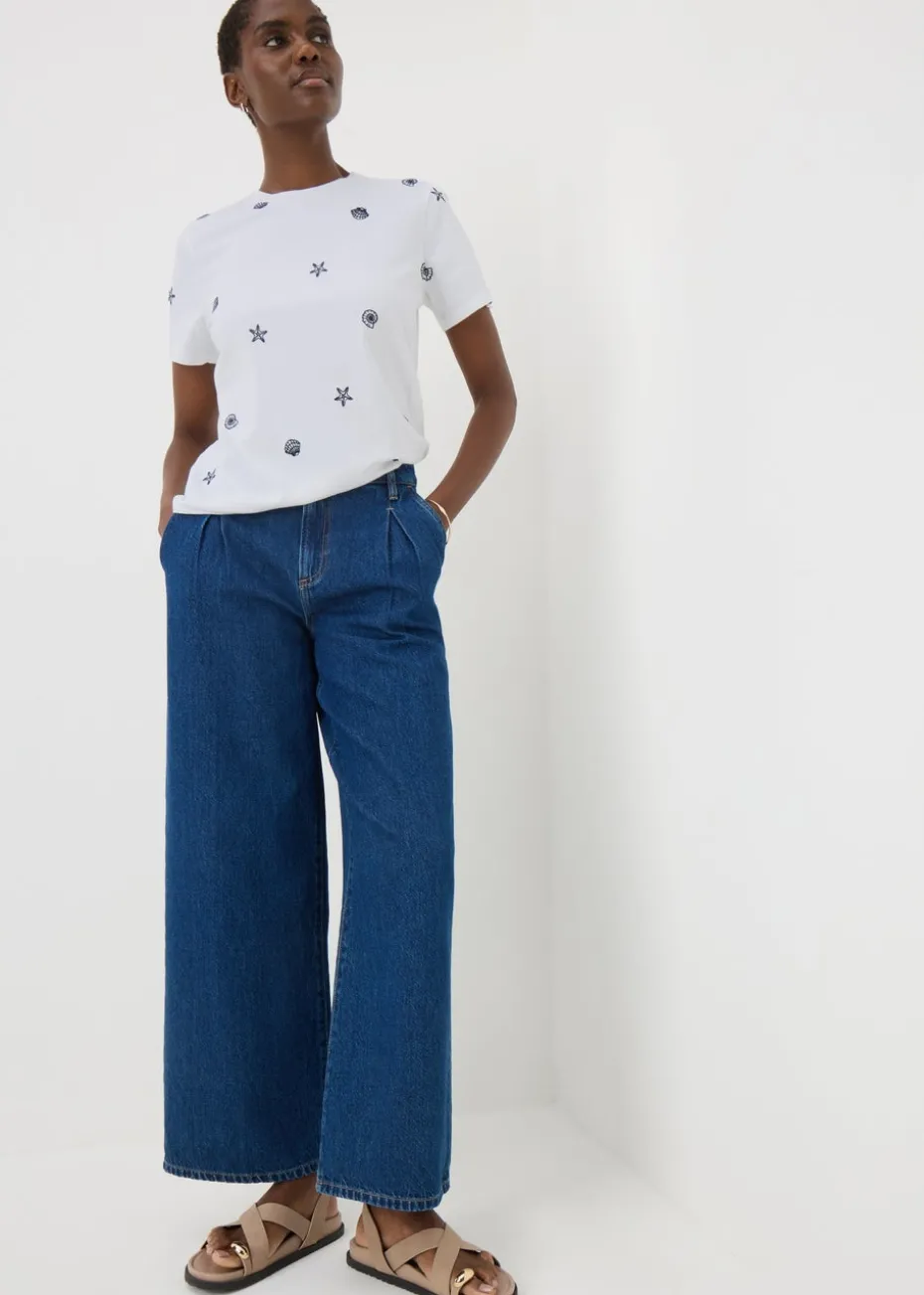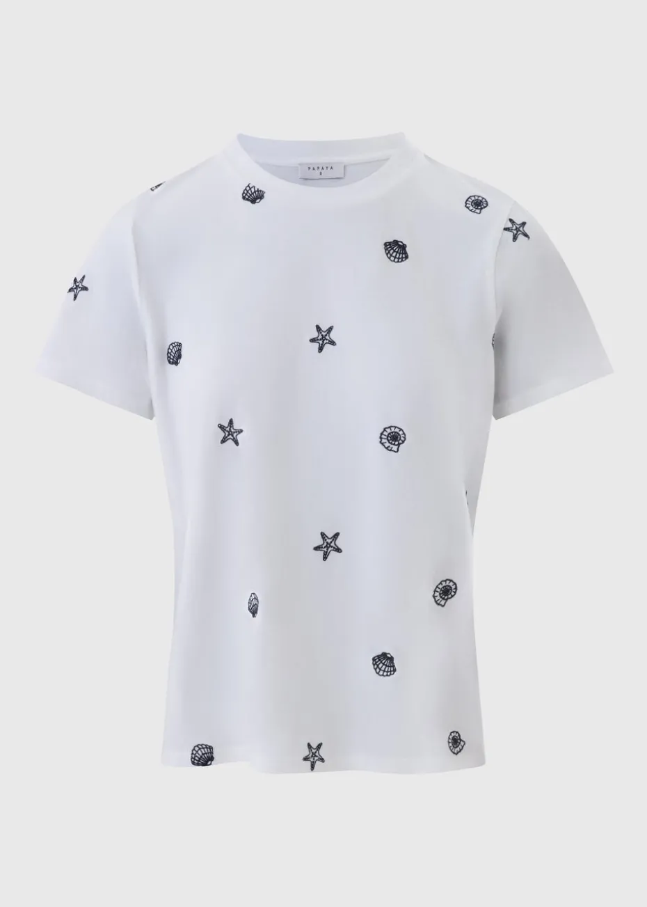 Add a touch of coastal charm to your wardrobe with the White Shell Embroidered T-Shirt. Featuring delicate shell embroidery, this soft, breathable tee offers a relaxed fit and timeless style. Perfect for casual days or layering under a jacket, its light and fresh design brings a subtle, beachy vibe to any outfit.