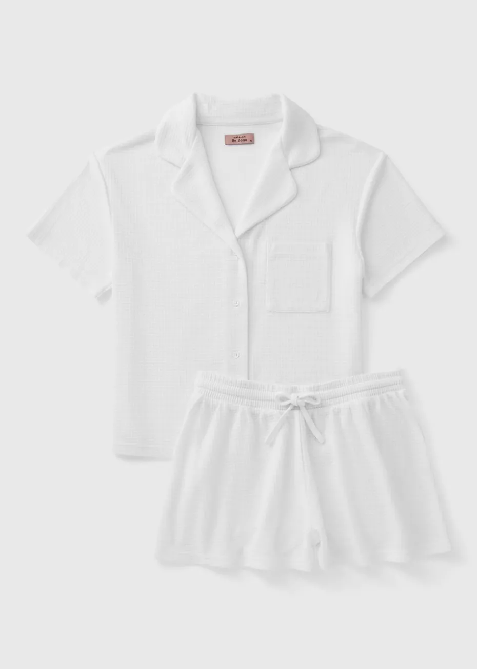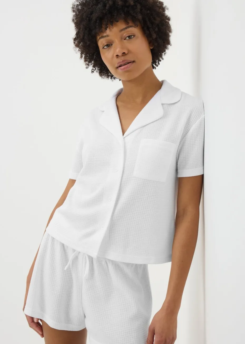 Sleep in style and wake up refreshed in the White Waffle Button Short Pyjama Set. Designed with comfort and simplicity in mind, this set features a soft waffle-textured fabric that feels light and breathable against the skin, ideal for warm nights or lounging in style. The button-up short-sleeve top pairs effortlessly with the relaxed-fit shorts for a look that’s both classic and modern. Finished in crisp white, it’s the perfect blend of laid-back premium and everyday comfort.