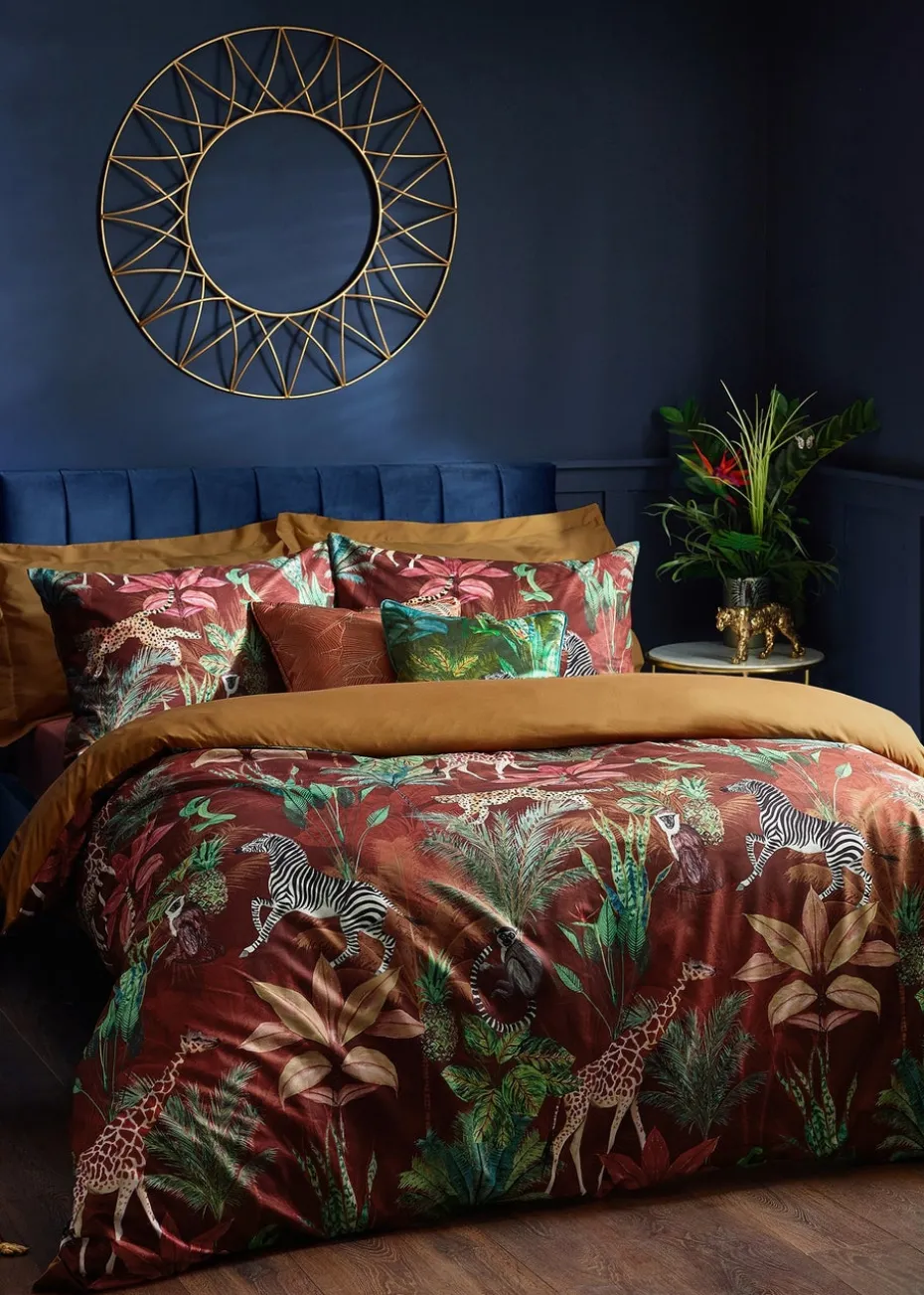 Add a bold and luxurious statement to your bedroom with this beautifully designed duvet cover set. Digitally printed on soft, sumptuous velvet fabric, Aranya is a feast for the eyes, capturing majestic animals in their lush, desert habitat, on a richly coloured sunset rust background. Finished with a luxury, plain gold reverse in lightweight polycotton and button fastenings, this set is perfect for adding a luxe feel to your bedroom.