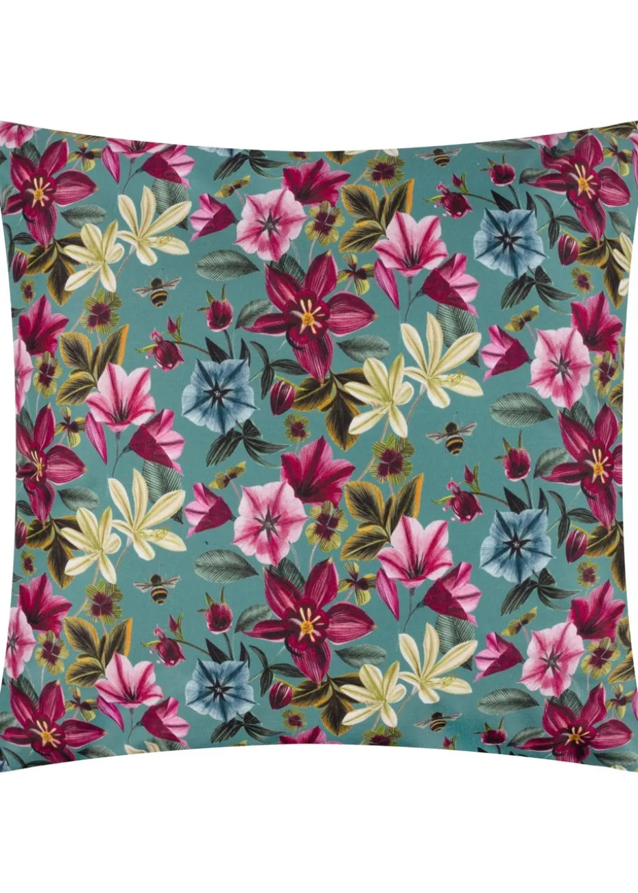 In amazing traditional hand painted, printed detail, a humble bumble bee hovers motionless, surrounded by bright country florals below, set on a complimenting teal background. If you turn it over, the bee has flown off and a further bunch of bright blooms are revealed in vivid detail and colour, to add cheerful tones to your outdoor styling, giving you two looks in one. Whichever way round, this cushion adds a summery flavour to a patio, balcony or terrace.